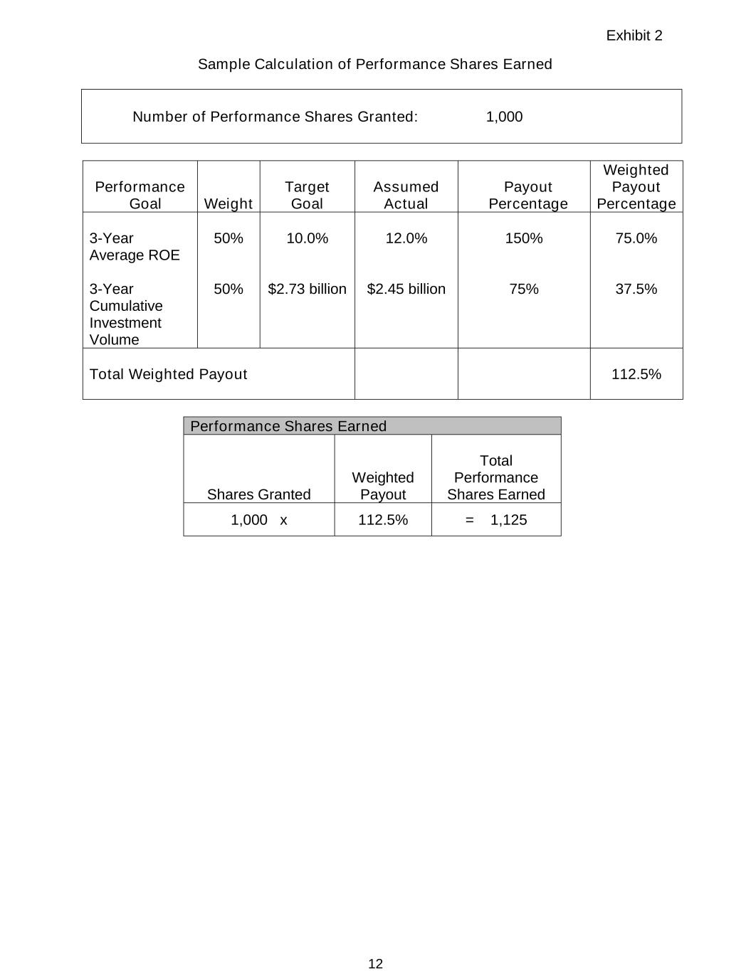 Exhibit 2 12 Sample Calculation of Performance Shares Earned Number of Performance Shares Granted: 1,000 Performance Goal Weight Target Goal Assumed Actual Payout Percentage Weighted Payout Percentage 3-Year Average ROE 3-Year Cumulative Investment Volume 50% 50% 10.0% $2.73 billion 12.0% $2.45 billion 150% 75% 75.0% 37.5% Total Weighted Payout 112.5% Performance Shares Earned Shares Granted Weighted Payout Total Performance Shares Earned 1,000 x 112.5% = 1,125
