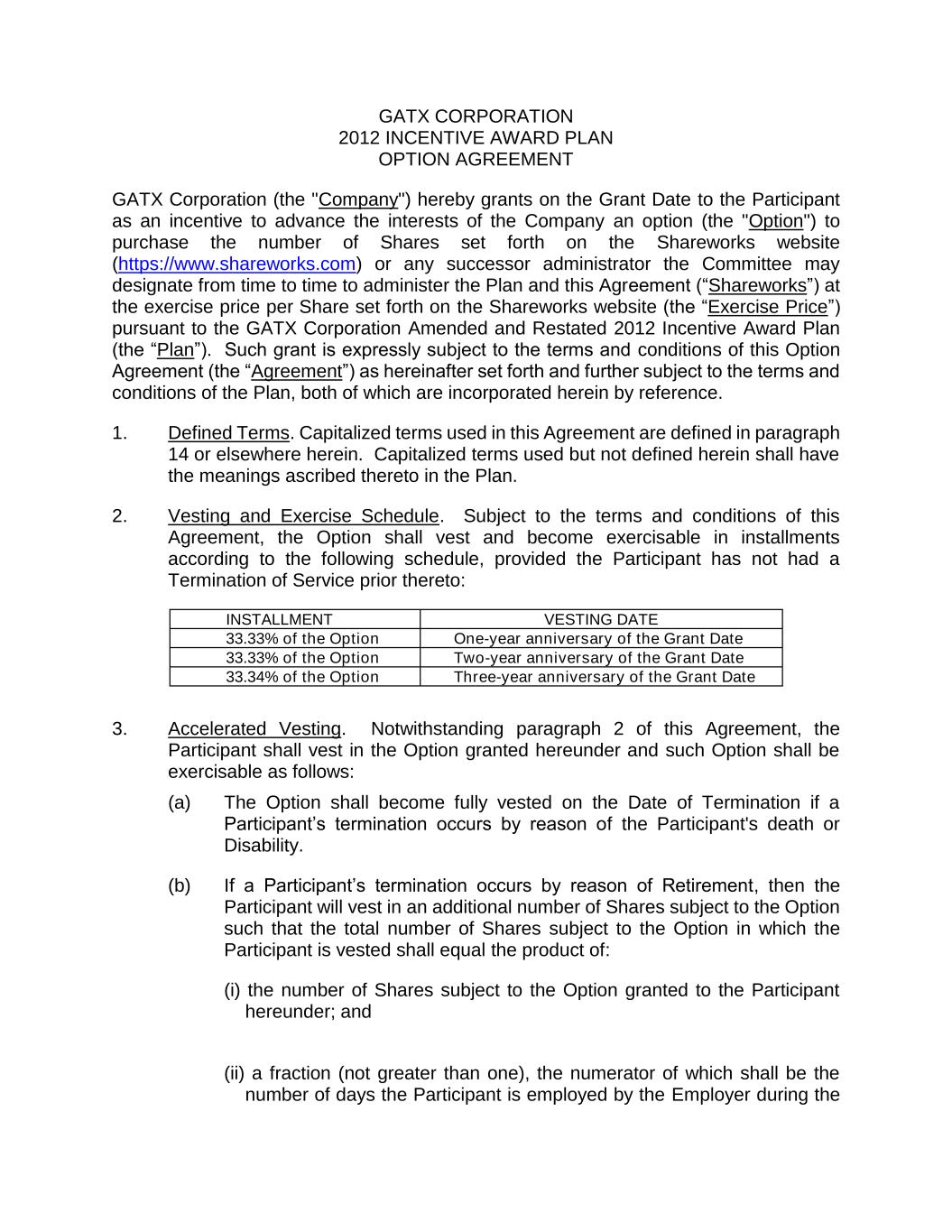 GATX CORPORATION 2012 INCENTIVE AWARD PLAN OPTION AGREEMENT GATX Corporation (the "Company") hereby grants on the Grant Date to the Participant as an incentive to advance the interests of the Company an option (the "Option") to purchase the number of Shares set forth on the Shareworks website (https://www.shareworks.com) or any successor administrator the Committee may designate from time to time to administer the Plan and this Agreement (“Shareworks”) at the exercise price per Share set forth on the Shareworks website (the “Exercise Price”) pursuant to the GATX Corporation Amended and Restated 2012 Incentive Award Plan (the “Plan”). Such grant is expressly subject to the terms and conditions of this Option Agreement (the “Agreement”) as hereinafter set forth and further subject to the terms and conditions of the Plan, both of which are incorporated herein by reference. 1. Defined Terms. Capitalized terms used in this Agreement are defined in paragraph 14 or elsewhere herein. Capitalized terms used but not defined herein shall have the meanings ascribed thereto in the Plan. 2. Vesting and Exercise Schedule. Subject to the terms and conditions of this Agreement, the Option shall vest and become exercisable in installments according to the following schedule, provided the Participant has not had a Termination of Service prior thereto: INSTALLMENT VESTING DATE 33.33% of the Option One-year anniversary of the Grant Date 33.33% of the Option Two-year anniversary of the Grant Date 33.34% of the Option Three-year anniversary of the Grant Date 3. Accelerated Vesting. Notwithstanding paragraph 2 of this Agreement, the Participant shall vest in the Option granted hereunder and such Option shall be exercisable as follows: (a) The Option shall become fully vested on the Date of Termination if a Participant’s termination occurs by reason of the Participant's death or Disability. (b) If a Participant’s termination occurs by reason of Retirement, then the Participant will vest in an additional number of Shares subject to the Option such that the total number of Shares subject to the Option in which the Participant is vested shall equal the product of: (i) the number of Shares subject to the Option granted to the Participant hereunder; and (ii) a fraction (not greater than one), the numerator of which shall be the number of days the Participant is employed by the Employer during the