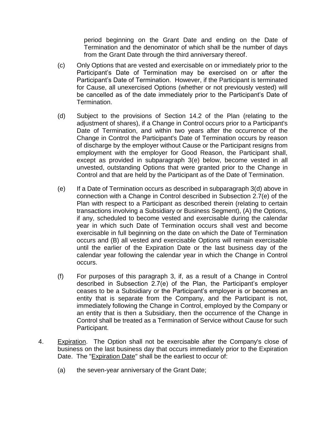 period beginning on the Grant Date and ending on the Date of Termination and the denominator of which shall be the number of days from the Grant Date through the third anniversary thereof. (c) Only Options that are vested and exercisable on or immediately prior to the Participant’s Date of Termination may be exercised on or after the Participant’s Date of Termination. However, if the Participant is terminated for Cause, all unexercised Options (whether or not previously vested) will be cancelled as of the date immediately prior to the Participant’s Date of Termination. (d) Subject to the provisions of Section 14.2 of the Plan (relating to the adjustment of shares), if a Change in Control occurs prior to a Participant's Date of Termination, and within two years after the occurrence of the Change in Control the Participant's Date of Termination occurs by reason of discharge by the employer without Cause or the Participant resigns from employment with the employer for Good Reason, the Participant shall, except as provided in subparagraph 3(e) below, become vested in all unvested, outstanding Options that were granted prior to the Change in Control and that are held by the Participant as of the Date of Termination. (e) If a Date of Termination occurs as described in subparagraph 3(d) above in connection with a Change in Control described in Subsection 2.7(e) of the Plan with respect to a Participant as described therein (relating to certain transactions involving a Subsidiary or Business Segment), (A) the Options, if any, scheduled to become vested and exercisable during the calendar year in which such Date of Termination occurs shall vest and become exercisable in full beginning on the date on which the Date of Termination occurs and (B) all vested and exercisable Options will remain exercisable until the earlier of the Expiration Date or the last business day of the calendar year following the calendar year in which the Change in Control occurs. (f) For purposes of this paragraph 3, if, as a result of a Change in Control described in Subsection 2.7(e) of the Plan, the Participant’s employer ceases to be a Subsidiary or the Participant’s employer is or becomes an entity that is separate from the Company, and the Participant is not, immediately following the Change in Control, employed by the Company or an entity that is then a Subsidiary, then the occurrence of the Change in Control shall be treated as a Termination of Service without Cause for such Participant. 4. Expiration. The Option shall not be exercisable after the Company's close of business on the last business day that occurs immediately prior to the Expiration Date. The "Expiration Date" shall be the earliest to occur of: (a) the seven-year anniversary of the Grant Date;