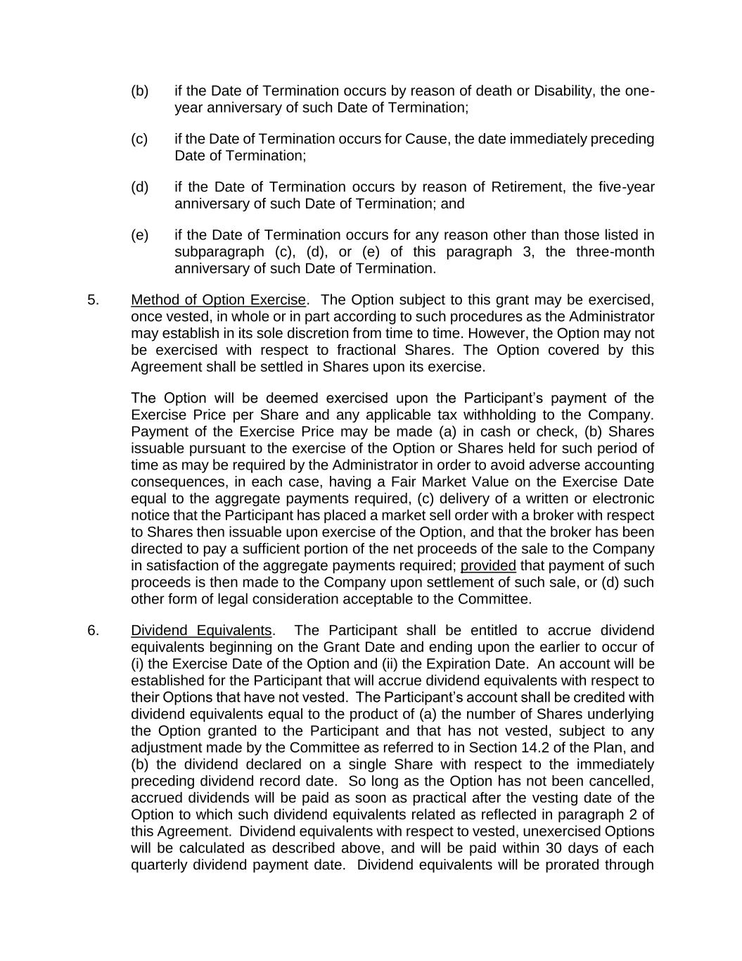 (b) if the Date of Termination occurs by reason of death or Disability, the one- year anniversary of such Date of Termination; (c) if the Date of Termination occurs for Cause, the date immediately preceding Date of Termination; (d) if the Date of Termination occurs by reason of Retirement, the five-year anniversary of such Date of Termination; and (e) if the Date of Termination occurs for any reason other than those listed in subparagraph (c), (d), or (e) of this paragraph 3, the three-month anniversary of such Date of Termination. 5. Method of Option Exercise. The Option subject to this grant may be exercised, once vested, in whole or in part according to such procedures as the Administrator may establish in its sole discretion from time to time. However, the Option may not be exercised with respect to fractional Shares. The Option covered by this Agreement shall be settled in Shares upon its exercise. The Option will be deemed exercised upon the Participant’s payment of the Exercise Price per Share and any applicable tax withholding to the Company. Payment of the Exercise Price may be made (a) in cash or check, (b) Shares issuable pursuant to the exercise of the Option or Shares held for such period of time as may be required by the Administrator in order to avoid adverse accounting consequences, in each case, having a Fair Market Value on the Exercise Date equal to the aggregate payments required, (c) delivery of a written or electronic notice that the Participant has placed a market sell order with a broker with respect to Shares then issuable upon exercise of the Option, and that the broker has been directed to pay a sufficient portion of the net proceeds of the sale to the Company in satisfaction of the aggregate payments required; provided that payment of such proceeds is then made to the Company upon settlement of such sale, or (d) such other form of legal consideration acceptable to the Committee. 6. Dividend Equivalents. The Participant shall be entitled to accrue dividend equivalents beginning on the Grant Date and ending upon the earlier to occur of (i) the Exercise Date of the Option and (ii) the Expiration Date. An account will be established for the Participant that will accrue dividend equivalents with respect to their Options that have not vested. The Participant’s account shall be credited with dividend equivalents equal to the product of (a) the number of Shares underlying the Option granted to the Participant and that has not vested, subject to any adjustment made by the Committee as referred to in Section 14.2 of the Plan, and (b) the dividend declared on a single Share with respect to the immediately preceding dividend record date. So long as the Option has not been cancelled, accrued dividends will be paid as soon as practical after the vesting date of the Option to which such dividend equivalents related as reflected in paragraph 2 of this Agreement. Dividend equivalents with respect to vested, unexercised Options will be calculated as described above, and will be paid within 30 days of each quarterly dividend payment date. Dividend equivalents will be prorated through