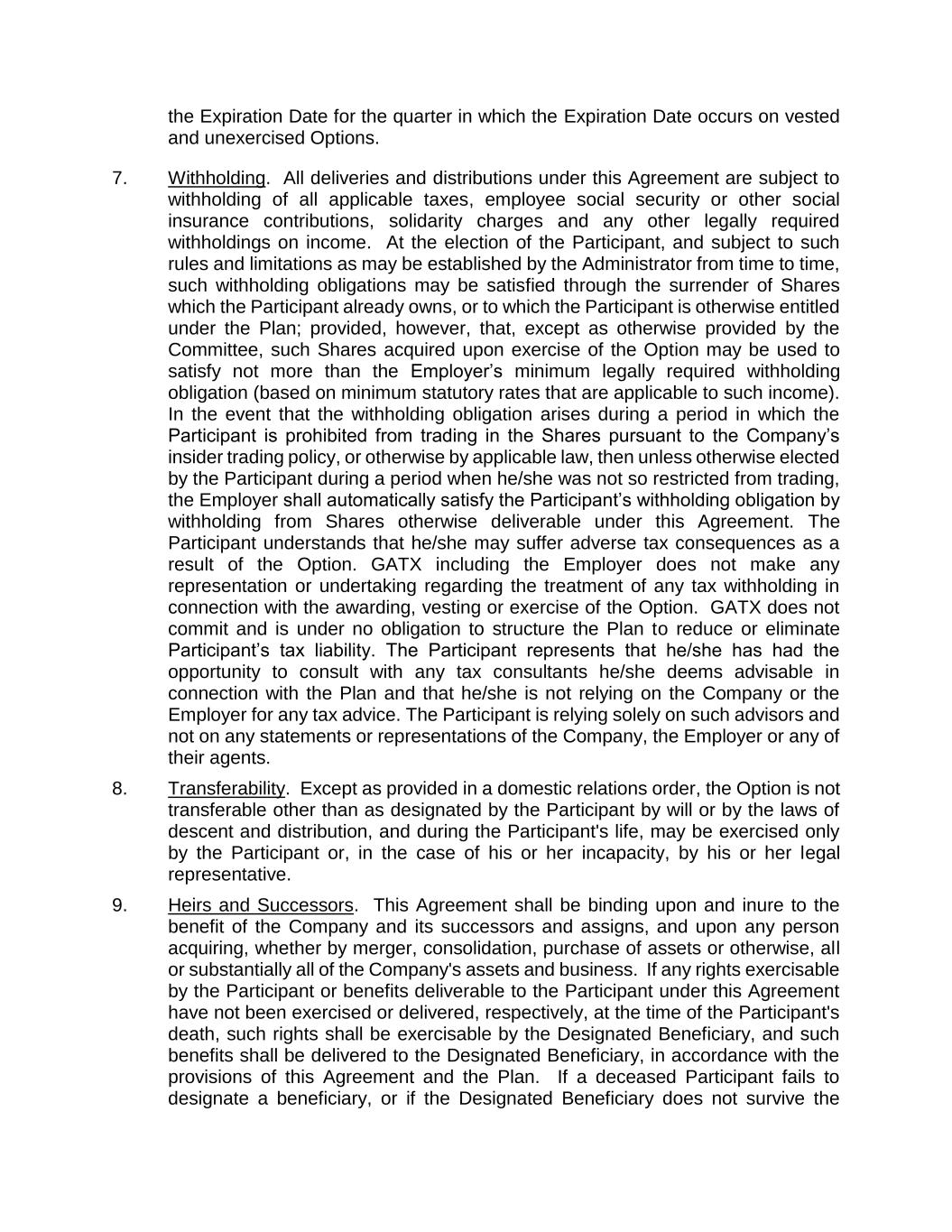 the Expiration Date for the quarter in which the Expiration Date occurs on vested and unexercised Options. 7. Withholding. All deliveries and distributions under this Agreement are subject to withholding of all applicable taxes, employee social security or other social insurance contributions, solidarity charges and any other legally required withholdings on income. At the election of the Participant, and subject to such rules and limitations as may be established by the Administrator from time to time, such withholding obligations may be satisfied through the surrender of Shares which the Participant already owns, or to which the Participant is otherwise entitled under the Plan; provided, however, that, except as otherwise provided by the Committee, such Shares acquired upon exercise of the Option may be used to satisfy not more than the Employer’s minimum legally required withholding obligation (based on minimum statutory rates that are applicable to such income). In the event that the withholding obligation arises during a period in which the Participant is prohibited from trading in the Shares pursuant to the Company’s insider trading policy, or otherwise by applicable law, then unless otherwise elected by the Participant during a period when he/she was not so restricted from trading, the Employer shall automatically satisfy the Participant’s withholding obligation by withholding from Shares otherwise deliverable under this Agreement. The Participant understands that he/she may suffer adverse tax consequences as a result of the Option. GATX including the Employer does not make any representation or undertaking regarding the treatment of any tax withholding in connection with the awarding, vesting or exercise of the Option. GATX does not commit and is under no obligation to structure the Plan to reduce or eliminate Participant’s tax liability. The Participant represents that he/she has had the opportunity to consult with any tax consultants he/she deems advisable in connection with the Plan and that he/she is not relying on the Company or the Employer for any tax advice. The Participant is relying solely on such advisors and not on any statements or representations of the Company, the Employer or any of their agents. 8. Transferability. Except as provided in a domestic relations order, the Option is not transferable other than as designated by the Participant by will or by the laws of descent and distribution, and during the Participant's life, may be exercised only by the Participant or, in the case of his or her incapacity, by his or her legal representative. 9. Heirs and Successors. This Agreement shall be binding upon and inure to the benefit of the Company and its successors and assigns, and upon any person acquiring, whether by merger, consolidation, purchase of assets or otherwise, all or substantially all of the Company's assets and business. If any rights exercisable by the Participant or benefits deliverable to the Participant under this Agreement have not been exercised or delivered, respectively, at the time of the Participant's death, such rights shall be exercisable by the Designated Beneficiary, and such benefits shall be delivered to the Designated Beneficiary, in accordance with the provisions of this Agreement and the Plan. If a deceased Participant fails to designate a beneficiary, or if the Designated Beneficiary does not survive the