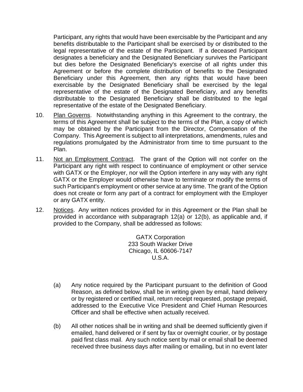 Participant, any rights that would have been exercisable by the Participant and any benefits distributable to the Participant shall be exercised by or distributed to the legal representative of the estate of the Participant. If a deceased Participant designates a beneficiary and the Designated Beneficiary survives the Participant but dies before the Designated Beneficiary's exercise of all rights under this Agreement or before the complete distribution of benefits to the Designated Beneficiary under this Agreement, then any rights that would have been exercisable by the Designated Beneficiary shall be exercised by the legal representative of the estate of the Designated Beneficiary, and any benefits distributable to the Designated Beneficiary shall be distributed to the legal representative of the estate of the Designated Beneficiary. 10. Plan Governs. Notwithstanding anything in this Agreement to the contrary, the terms of this Agreement shall be subject to the terms of the Plan, a copy of which may be obtained by the Participant from the Director, Compensation of the Company. This Agreement is subject to all interpretations, amendments, rules and regulations promulgated by the Administrator from time to time pursuant to the Plan. 11. Not an Employment Contract. The grant of the Option will not confer on the Participant any right with respect to continuance of employment or other service with GATX or the Employer, nor will the Option interfere in any way with any right GATX or the Employer would otherwise have to terminate or modify the terms of such Participant's employment or other service at any time. The grant of the Option does not create or form any part of a contract for employment with the Employer or any GATX entity. 12. Notices. Any written notices provided for in this Agreement or the Plan shall be provided in accordance with subparagraph 12(a) or 12(b), as applicable and, if provided to the Company, shall be addressed as follows: GATX Corporation 233 South Wacker Drive Chicago, IL 60606-7147 U.S.A. (a) Any notice required by the Participant pursuant to the definition of Good Reason, as defined below, shall be in writing given by email, hand delivery or by registered or certified mail, return receipt requested, postage prepaid, addressed to the Executive Vice President and Chief Human Resources Officer and shall be effective when actually received. (b) All other notices shall be in writing and shall be deemed sufficiently given if emailed, hand delivered or if sent by fax or overnight courier, or by postage paid first class mail. Any such notice sent by mail or email shall be deemed received three business days after mailing or emailing, but in no event later