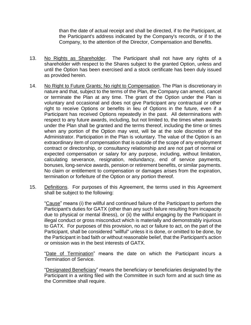 than the date of actual receipt and shall be directed, if to the Participant, at the Participant's address indicated by the Company's records, or if to the Company, to the attention of the Director, Compensation and Benefits. 13. No Rights as Shareholder. The Participant shall not have any rights of a shareholder with respect to the Shares subject to the granted Option, unless and until the Option has been exercised and a stock certificate has been duly issued as provided herein. 14. No Right to Future Grants; No right to Compensation. The Plan is discretionary in nature and that, subject to the terms of the Plan, the Company can amend, cancel or terminate the Plan at any time. The grant of the Option under the Plan is voluntary and occasional and does not give Participant any contractual or other right to receive Options or benefits in lieu of Options in the future, even if a Participant has received Options repeatedly in the past. All determinations with respect to any future awards, including, but not limited to, the times when awards under the Plan shall be granted and the terms thereof, including the time or times when any portion of the Option may vest, will be at the sole discretion of the Administrator. Participation in the Plan is voluntary. The value of the Option is an extraordinary item of compensation that is outside of the scope of any employment contract or directorship, or consultancy relationship and are not part of normal or expected compensation or salary for any purpose, including, without limitation, calculating severance, resignation, redundancy, end of service payments, bonuses, long-service awards, pension or retirement benefits, or similar payments. No claim or entitlement to compensation or damages arises from the expiration, termination or forfeiture of the Option or any portion thereof. 15. Definitions. For purposes of this Agreement, the terms used in this Agreement shall be subject to the following: “Cause” means (i) the willful and continued failure of the Participant to perform the Participant's duties for GATX (other than any such failure resulting from incapacity due to physical or mental illness), or (ii) the willful engaging by the Participant in illegal conduct or gross misconduct which is materially and demonstrably injurious to GATX. For purposes of this provision, no act or failure to act, on the part of the Participant, shall be considered "willful" unless it is done, or omitted to be done, by the Participant in bad faith or without reasonable belief, that the Participant's action or omission was in the best interests of GATX. “Date of Termination” means the date on which the Participant incurs a Termination of Service. “Designated Beneficiary” means the beneficiary or beneficiaries designated by the Participant in a writing filed with the Committee in such form and at such time as the Committee shall require.