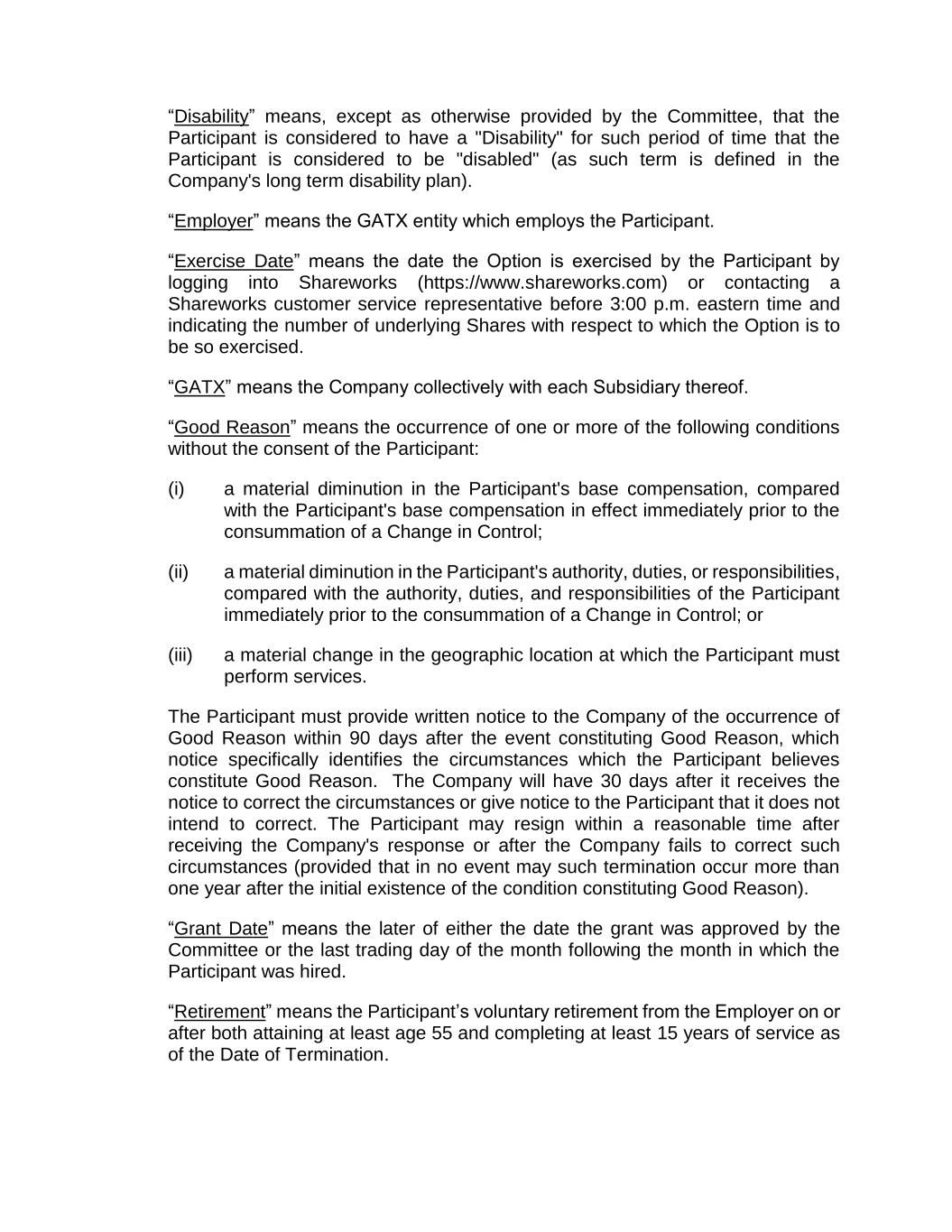 “Disability” means, except as otherwise provided by the Committee, that the Participant is considered to have a "Disability" for such period of time that the Participant is considered to be "disabled" (as such term is defined in the Company's long term disability plan). “Employer” means the GATX entity which employs the Participant. “Exercise Date” means the date the Option is exercised by the Participant by logging into Shareworks (https://www.shareworks.com) or contacting a Shareworks customer service representative before 3:00 p.m. eastern time and indicating the number of underlying Shares with respect to which the Option is to be so exercised. “GATX” means the Company collectively with each Subsidiary thereof. “Good Reason” means the occurrence of one or more of the following conditions without the consent of the Participant: (i) a material diminution in the Participant's base compensation, compared with the Participant's base compensation in effect immediately prior to the consummation of a Change in Control; (ii) a material diminution in the Participant's authority, duties, or responsibilities, compared with the authority, duties, and responsibilities of the Participant immediately prior to the consummation of a Change in Control; or (iii) a material change in the geographic location at which the Participant must perform services. The Participant must provide written notice to the Company of the occurrence of Good Reason within 90 days after the event constituting Good Reason, which notice specifically identifies the circumstances which the Participant believes constitute Good Reason. The Company will have 30 days after it receives the notice to correct the circumstances or give notice to the Participant that it does not intend to correct. The Participant may resign within a reasonable time after receiving the Company's response or after the Company fails to correct such circumstances (provided that in no event may such termination occur more than one year after the initial existence of the condition constituting Good Reason). “Grant Date” means the later of either the date the grant was approved by the Committee or the last trading day of the month following the month in which the Participant was hired. “Retirement” means the Participant’s voluntary retirement from the Employer on or after both attaining at least age 55 and completing at least 15 years of service as of the Date of Termination.