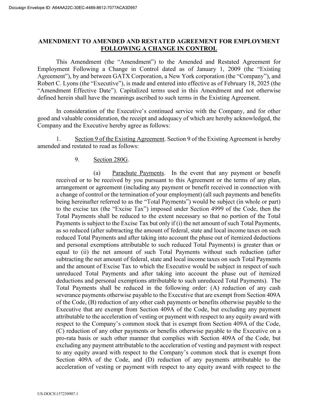 US-DOCS\157230907.1 AMENDMENT TO AMENDED AND RESTATED AGREEMENT FOR EMPLOYMENT FOLLOWING A CHANGE IN CONTROL This Amendment to the Amended and Restated Agreement for Employment Following a Change in Control dated as of January 1, 2009 , by and between GATX Corporation, a New York ), and Robert C. Lyons is made and entered into effective as of February 18, 2025 (the Amendment Effective Date nt and not otherwise defined herein shall have the meanings ascribed to such terms in the Existing Agreement. In consideration of the good and valuable consideration, the receipt and adequacy of which are hereby acknowledged, the Company and the Executive hereby agree as follows: 1. Section 9 of the Existing Agreement. Section 9 of the Existing Agreement is hereby amended and restated to read as follows: 9. Section 280G. (a) Parachute Payments. In the event that any payment or benefit received or to be received by you pursuant to this Agreement or the terms of any plan, arrangement or agreement (including any payment or benefit received in connection with a change of control or the termination of your employment) (all such payments and benefits being hereinafter referred to as the t Total Payments shall be reduced to the extent necessary so that no portion of the Total Payments is subject to the Excise Tax but only if (i) the net amount of such Total Payments, as so reduced (after subtracting the amount of federal, state and local income taxes on such reduced Total Payments and after taking into account the phase out of itemized deductions and personal exemptions attributable to such reduced Total Payments) is greater than or equal to (ii) the net amount of such Total Payments without such reduction (after subtracting the net amount of federal, state and local income taxes on such Total Payments and the amount of Excise Tax to which the Executive would be subject in respect of such unreduced Total Payments and after taking into account the phase out of itemized deductions and personal exemptions attributable to such unreduced Total Payments). The Total Payments shall be reduced in the following order: (A) reduction of any cash severance payments otherwise payable to the Executive that are exempt from Section 409A of the Code, (B) reduction of any other cash payments or benefits otherwise payable to the Executive that are exempt from Section 409A of the Code, but excluding any payment attributable to the acceleration of vesting or payment with respect to any equity award with (C) reduction of any other payments or benefits otherwise payable to the Executive on a pro-rata basis or such other manner that complies with Section 409A of the Code, but excluding any payment attributable to the acceleration of vesting and payment with respect to any equity award with respect to the Section 409A of the Code, and (D) reduction of any payments attributable to the acceleration of vesting or payment with respect to any equity award with respect to the