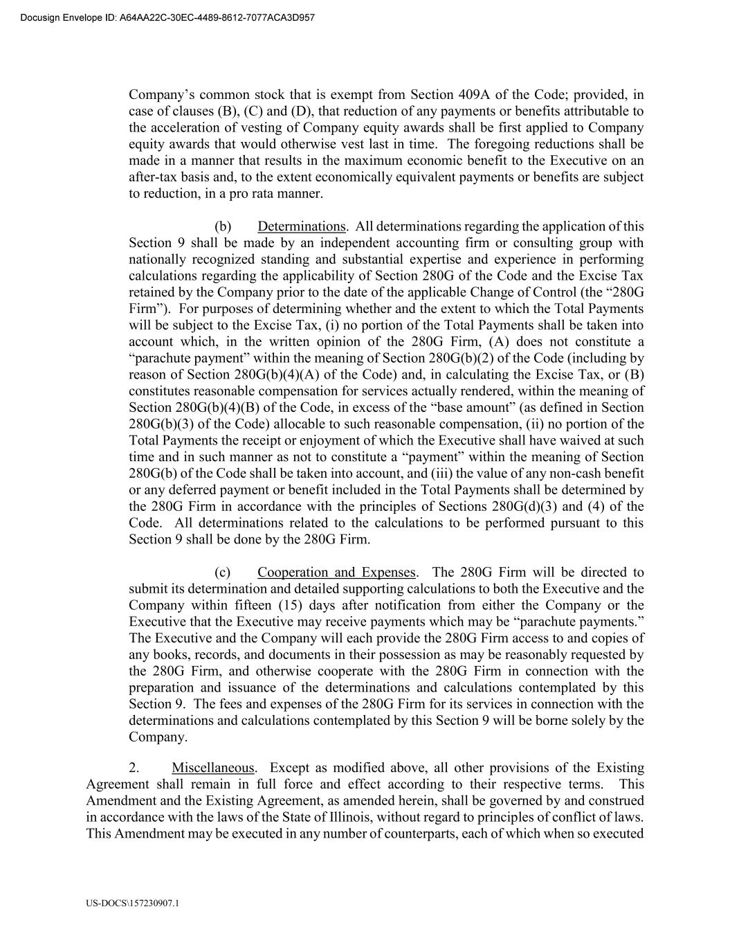 US-DOCS\157230907.1 ction 409A of the Code; provided, in case of clauses (B), (C) and (D), that reduction of any payments or benefits attributable to the acceleration of vesting of Company equity awards shall be first applied to Company equity awards that would otherwise vest last in time. The foregoing reductions shall be made in a manner that results in the maximum economic benefit to the Executive on an after-tax basis and, to the extent economically equivalent payments or benefits are subject to reduction, in a pro rata manner. (b) Determinations. All determinations regarding the application of this Section 9 shall be made by an independent accounting firm or consulting group with nationally recognized standing and substantial expertise and experience in performing calculations regarding the applicability of Section 280G of the Code and the Excise Tax retained by the Company prior to the date of the applicable Change of Control (the 280G will be subject to the Excise Tax, (i) no portion of the Total Payments shall be taken into account which, in the written opinion of the 280G Firm, (A) does not constitute a parachute payment within the meaning of Section 280G(b)(2) of the Code (including by reason of Section 280G(b)(4)(A) of the Code) and, in calculating the Excise Tax, or (B) constitutes reasonable compensation for services actually rendered, within the meaning of Section 280G(b)(4)(B) of the Code, in excess of the base amount (as defined in Section 280G(b)(3) of the Code) allocable to such reasonable compensation, (ii) no portion of the Total Payments the receipt or enjoyment of which the Executive shall have waived at such time and in such manner as not to constitute a payment within the meaning of Section 280G(b) of the Code shall be taken into account, and (iii) the value of any non-cash benefit or any deferred payment or benefit included in the Total Payments shall be determined by the 280G Firm in accordance with the principles of Sections 280G(d)(3) and (4) of the Code. All determinations related to the calculations to be performed pursuant to this Section 9 shall be done by the 280G Firm. (c) Cooperation and Expenses. The 280G Firm will be directed to submit its determination and detailed supporting calculations to both the Executive and the Company within fifteen (15) days after notification from either the Company or the Executive that the Executive may receive payments which may be parachute payments. The Executive and the Company will each provide the 280G Firm access to and copies of any books, records, and documents in their possession as may be reasonably requested by the 280G Firm, and otherwise cooperate with the 280G Firm in connection with the preparation and issuance of the determinations and calculations contemplated by this Section 9. The fees and expenses of the 280G Firm for its services in connection with the determinations and calculations contemplated by this Section 9 will be borne solely by the Company. 2. Miscellaneous. Except as modified above, all other provisions of the Existing Agreement shall remain in full force and effect according to their respective terms. This Amendment and the Existing Agreement, as amended herein, shall be governed by and construed in accordance with the laws of the State of Illinois, without regard to principles of conflict of laws. This Amendment may be executed in any number of counterparts, each of which when so executed