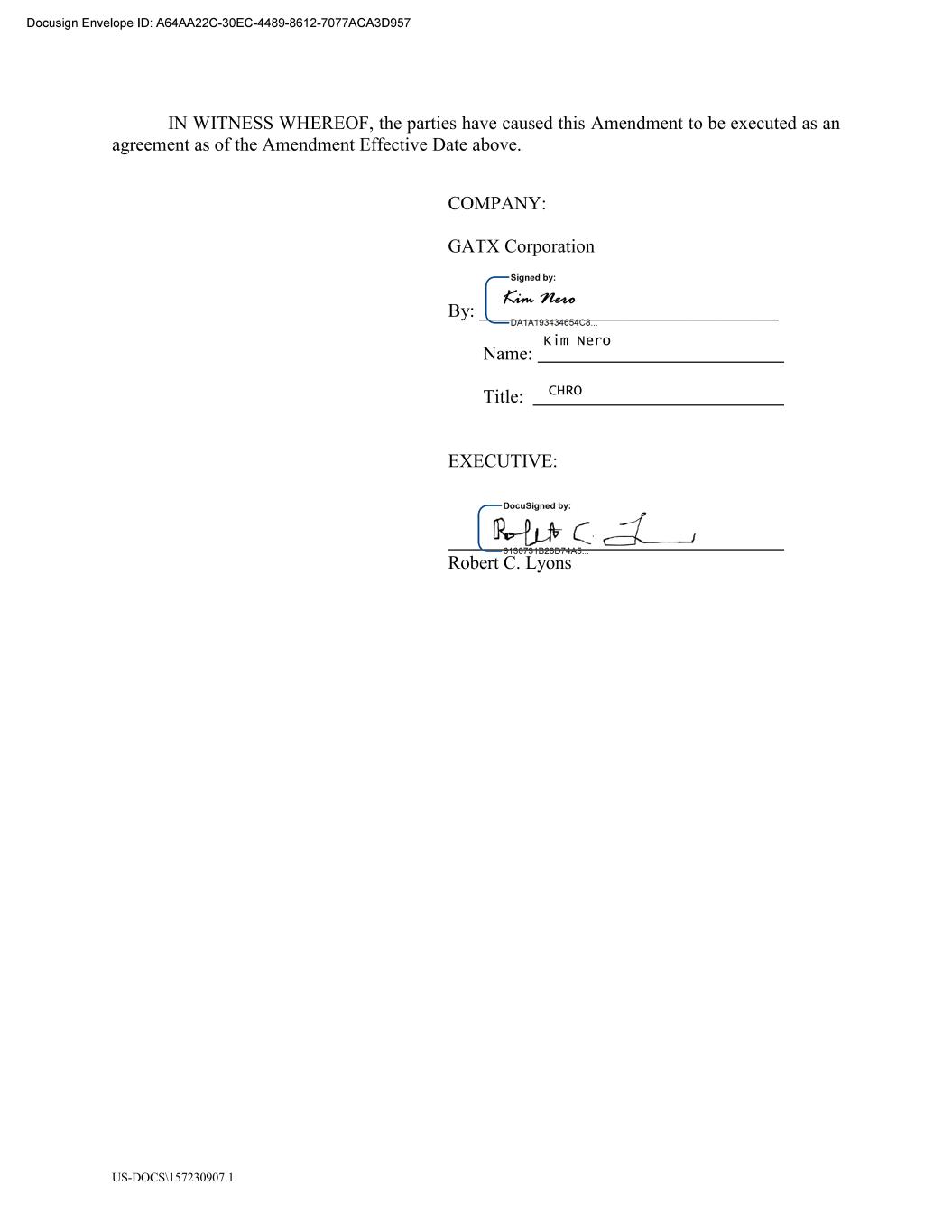 US-DOCS\157230907.1 IN WITNESS WHEREOF, the parties have caused this Amendment to be executed as an agreement as of the Amendment Effective Date above. COMPANY: GATX Corporation By: ________________________________ Name: Title: EXECUTIVE: Robert C. Lyons