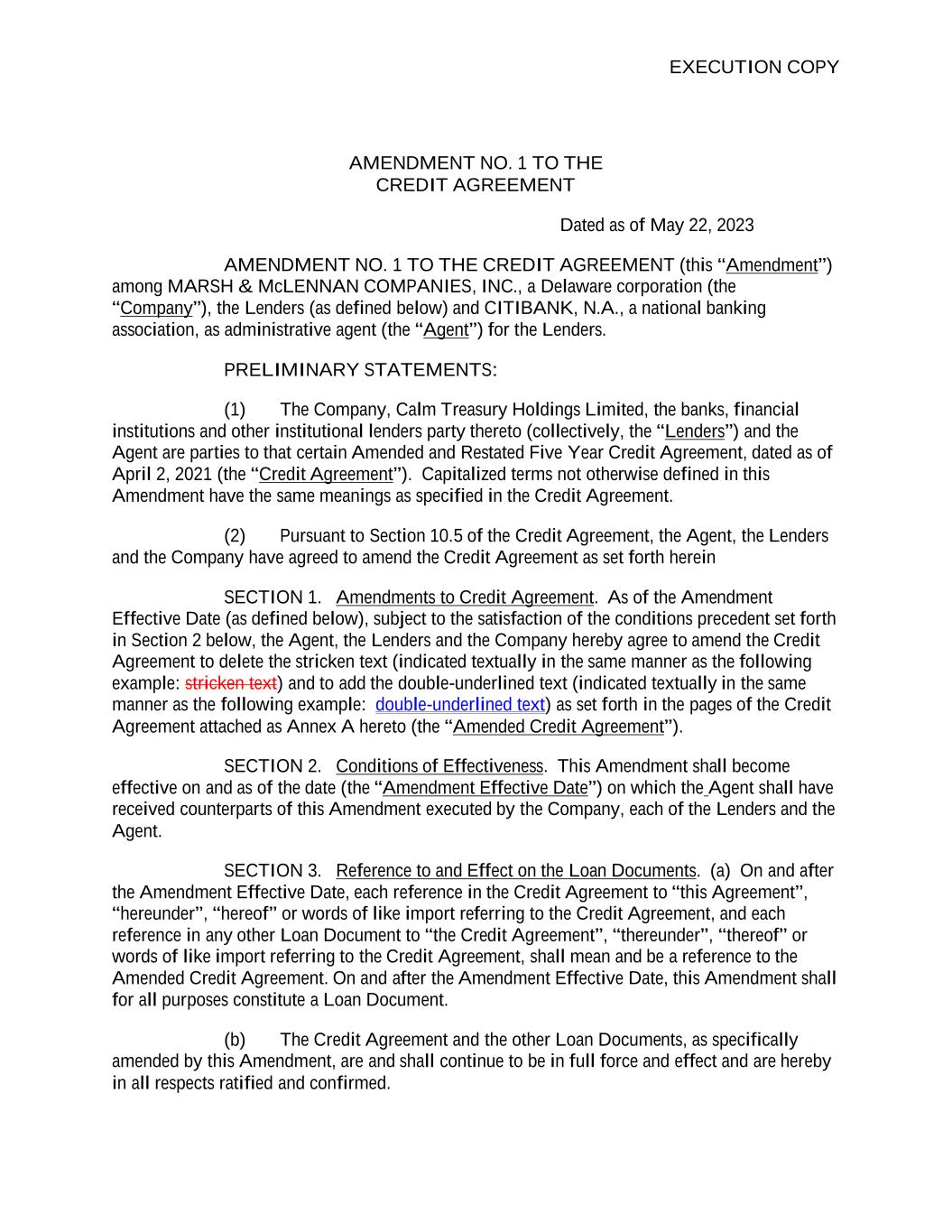 EXECUTION COPY AMENDMENT NO. 1 TO THE CREDIT AGREEMENT Dated as of May 22, 2023 AMENDMENT NO. 1 TO THE CREDIT AGREEMENT (this “Amendment”) among MARSH & McLENNAN COMPANIES, INC., a Delaware corporation (the “Company”), the Lenders (as defined below) and CITIBANK, N.A., a national banking association, as administrative agent (the “Agent”) for the Lenders. PRELIMINARY STATEMENTS: (1) The Company, Calm Treasury Holdings Limited, the banks, financial institutions and other institutional lenders party thereto (collectively, the “Lenders”) and the Agent are parties to that certain Amended and Restated Five Year Credit Agreement, dated as of April 2, 2021 (the “Credit Agreement”). Capitalized terms not otherwise defined in this Amendment have the same meanings as specified in the Credit Agreement. (2) Pursuant to Section 10.5 of the Credit Agreement, the Agent, the Lenders and the Company have agreed to amend the Credit Agreement as set forth herein SECTION 1. Amendments to Credit Agreement. As of the Amendment Effective Date (as defined below), subject to the satisfaction of the conditions precedent set forth in Section 2 below, the Agent, the Lenders and the Company hereby agree to amend the Credit Agreement to delete the stricken text (indicated textually in the same manner as the following example: stricken text) and to add the double-underlined text (indicated textually in the same manner as the following example: double-underlined text) as set forth in the pages of the Credit Agreement attached as Annex A hereto (the “Amended Credit Agreement”). SECTION 2. Conditions of Effectiveness. This Amendment shall become effective on and as of the date (the “Amendment Effective Date”) on which the Agent shall have received counterparts of this Amendment executed by the Company, each of the Lenders and the Agent. SECTION 3. Reference to and Effect on the Loan Documents. (a) On and after the Amendment Effective Date, each reference in the Credit Agreement to “this Agreement”, “hereunder”, “hereof” or words of like import referring to the Credit Agreement, and each reference in any other Loan Document to “the Credit Agreement”, “thereunder”, “thereof” or words of like import referring to the Credit Agreement, shall mean and be a reference to the Amended Credit Agreement. On and after the Amendment Effective Date, this Amendment shall for all purposes constitute a Loan Document. (b) The Credit Agreement and the other Loan Documents, as specifically amended by this Amendment, are and shall continue to be in full force and effect and are hereby in all respects ratified and confirmed.