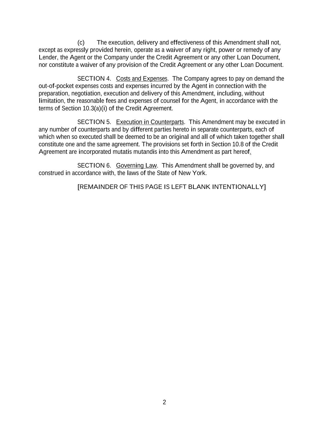 2 (c) The execution, delivery and effectiveness of this Amendment shall not, except as expressly provided herein, operate as a waiver of any right, power or remedy of any Lender, the Agent or the Company under the Credit Agreement or any other Loan Document, nor constitute a waiver of any provision of the Credit Agreement or any other Loan Document. SECTION 4. Costs and Expenses. The Company agrees to pay on demand the out-of-pocket expenses costs and expenses incurred by the Agent in connection with the preparation, negotiation, execution and delivery of this Amendment, including, without limitation, the reasonable fees and expenses of counsel for the Agent, in accordance with the terms of Section 10.3(a)(i) of the Credit Agreement. SECTION 5. Execution in Counterparts. This Amendment may be executed in any number of counterparts and by different parties hereto in separate counterparts, each of which when so executed shall be deemed to be an original and all of which taken together shall constitute one and the same agreement. The provisions set forth in Section 10.8 of the Credit Agreement are incorporated mutatis mutandis into this Amendment as part hereof. SECTION 6. Governing Law. This Amendment shall be governed by, and construed in accordance with, the laws of the State of New York. [REMAINDER OF THIS PAGE IS LEFT BLANK INTENTIONALLY]