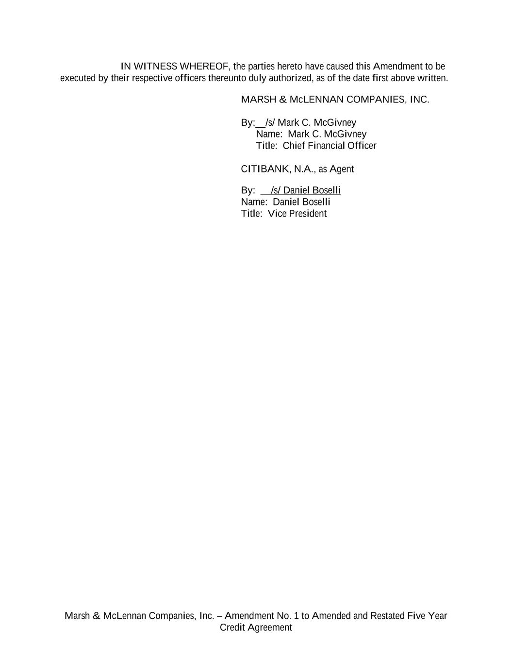 Marsh & McLennan Companies, Inc. – Amendment No. 1 to Amended and Restated Five Year Credit Agreement IN WITNESS WHEREOF, the parties hereto have caused this Amendment to be executed by their respective officers thereunto duly authorized, as of the date first above written. MARSH & McLENNAN COMPANIES, INC. By:__/s/ Mark C. McGivney Name: Mark C. McGivney Title: Chief Financial Officer CITIBANK, N.A., as Agent By: /s/ Daniel Boselli Name: Daniel Boselli Title: Vice President