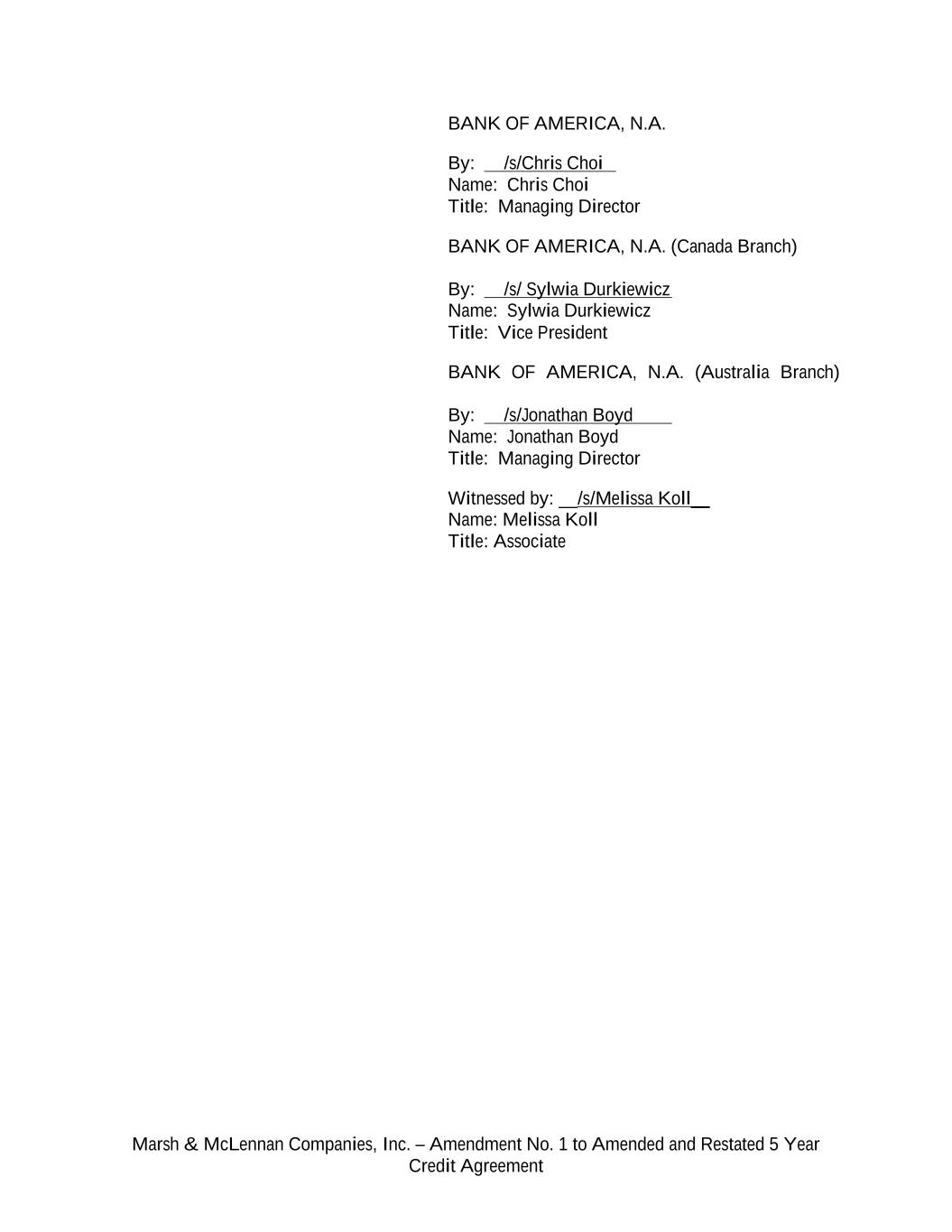 Marsh & McLennan Companies, Inc. – Amendment No. 1 to Amended and Restated 5 Year Credit Agreement BANK OF AMERICA, N.A. By: /s/Chris Choi Name: Chris Choi Title: Managing Director BANK OF AMERICA, N.A. (Canada Branch) By: /s/ Sylwia Durkiewicz Name: Sylwia Durkiewicz Title: Vice President BANK OF AMERICA, N.A. (Australia Branch) By: /s/Jonathan Boyd Name: Jonathan Boyd Title: Managing Director Witnessed by: __/s/Melissa Koll__ Name: Melissa Koll Title: Associate