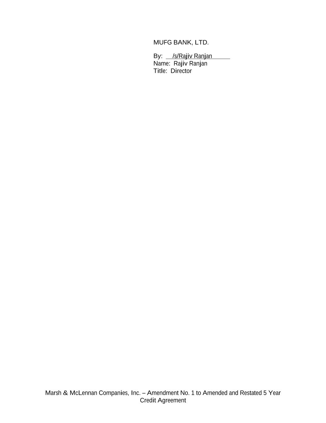 Marsh & McLennan Companies, Inc. – Amendment No. 1 to Amended and Restated 5 Year Credit Agreement MUFG BANK, LTD. By: /s/Rajiv Ranjan Name: Rajiv Ranjan Title: Director