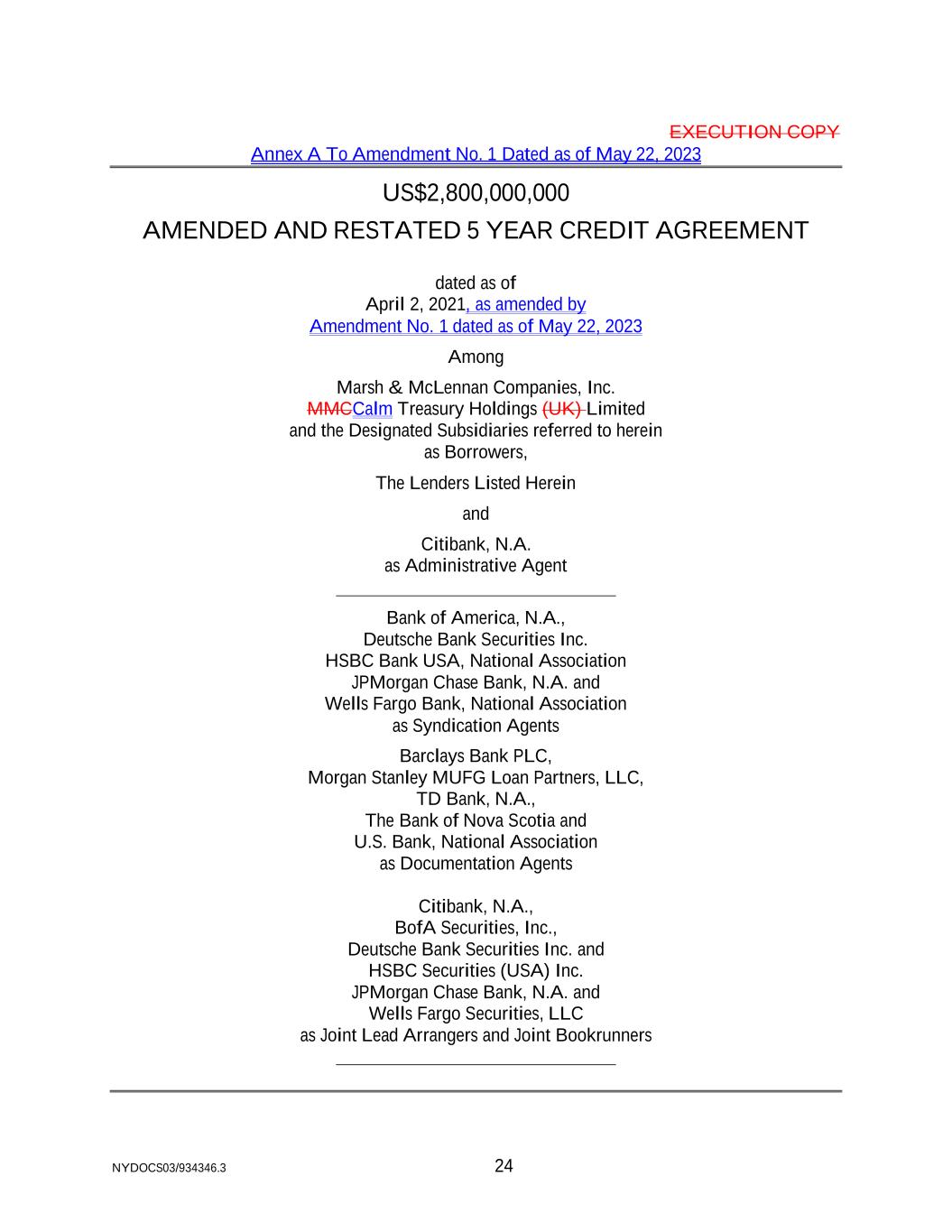 NYDOCS03/934346.3 24 EXECUTION COPY Annex A To Amendment No. 1 Dated as of May 22, 2023 US$2,800,000,000 AMENDED AND RESTATED 5 YEAR CREDIT AGREEMENT dated as of April 2, 2021, as amended by Amendment No. 1 dated as of May 22, 2023 Among Marsh & McLennan Companies, Inc. MMCCalm Treasury Holdings (UK) Limited and the Designated Subsidiaries referred to herein as Borrowers, The Lenders Listed Herein and Citibank, N.A. as Administrative Agent Bank of America, N.A., Deutsche Bank Securities Inc. HSBC Bank USA, National Association JPMorgan Chase Bank, N.A. and Wells Fargo Bank, National Association as Syndication Agents Barclays Bank PLC, Morgan Stanley MUFG Loan Partners, LLC, TD Bank, N.A., The Bank of Nova Scotia and U.S. Bank, National Association as Documentation Agents Citibank, N.A., BofA Securities, Inc., Deutsche Bank Securities Inc. and HSBC Securities (USA) Inc. JPMorgan Chase Bank, N.A. and Wells Fargo Securities, LLC as Joint Lead Arrangers and Joint Bookrunners