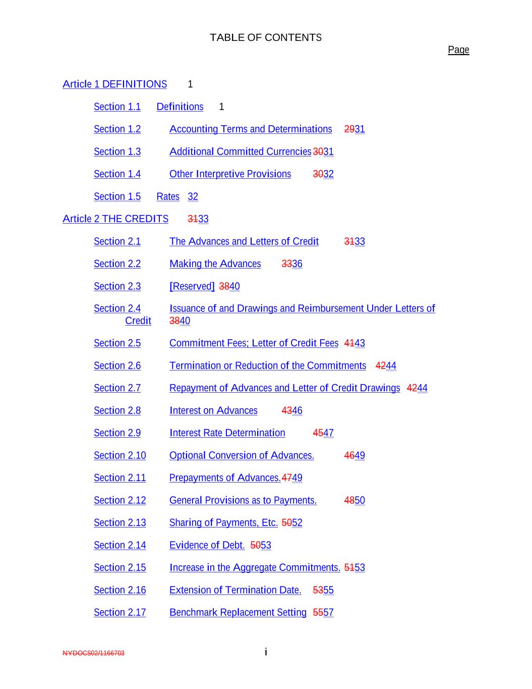 TABLE OF CONTENTS Page NYDOCS02/1166703 i Article 1 DEFINITIONS 1 Section 1.1 Definitions 1 Section 1.2 Accounting Terms and Determinations 2931 Section 1.3 Additional Committed Currencies 3031 Section 1.4 Other Interpretive Provisions 3032 Section 1.5 Rates 32 Article 2 THE CREDITS 3133 Section 2.1 The Advances and Letters of Credit 3133 Section 2.2 Making the Advances 3336 Section 2.3 [Reserved] 3840 Section 2.4 Issuance of and Drawings and Reimbursement Under Letters of Credit 3840 Section 2.5 Commitment Fees; Letter of Credit Fees 4143 Section 2.6 Termination or Reduction of the Commitments 4244 Section 2.7 Repayment of Advances and Letter of Credit Drawings 4244 Section 2.8 Interest on Advances 4346 Section 2.9 Interest Rate Determination 4547 Section 2.10 Optional Conversion of Advances. 4649 Section 2.11 Prepayments of Advances.4749 Section 2.12 General Provisions as to Payments. 4850 Section 2.13 Sharing of Payments, Etc. 5052 Section 2.14 Evidence of Debt. 5053 Section 2.15 Increase in the Aggregate Commitments. 5153 Section 2.16 Extension of Termination Date. 5355 Section 2.17 Benchmark Replacement Setting 5557