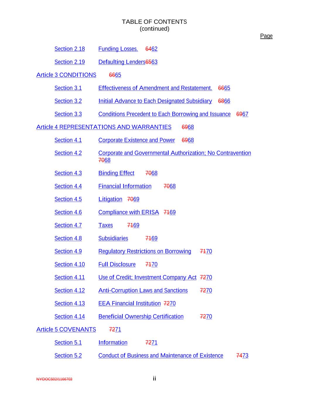 TABLE OF CONTENTS (continued) Page NYDOCS02/1166703 ii Section 2.18 Funding Losses. 6462 Section 2.19 Defaulting Lenders6563 Article 3 CONDITIONS 6665 Section 3.1 Effectiveness of Amendment and Restatement. 6665 Section 3.2 Initial Advance to Each Designated Subsidiary 6866 Section 3.3 Conditions Precedent to Each Borrowing and Issuance 6967 Article 4 REPRESENTATIONS AND WARRANTIES 6968 Section 4.1 Corporate Existence and Power 6968 Section 4.2 Corporate and Governmental Authorization; No Contravention 7068 Section 4.3 Binding Effect 7068 Section 4.4 Financial Information 7068 Section 4.5 Litigation 7069 Section 4.6 Compliance with ERISA 7169 Section 4.7 Taxes 7169 Section 4.8 Subsidiaries 7169 Section 4.9 Regulatory Restrictions on Borrowing 7170 Section 4.10 Full Disclosure 7170 Section 4.11 Use of Credit; Investment Company Act 7270 Section 4.12 Anti-Corruption Laws and Sanctions 7270 Section 4.13 EEA Financial Institution 7270 Section 4.14 Beneficial Ownership Certification 7270 Article 5 COVENANTS 7271 Section 5.1 Information 7271 Section 5.2 Conduct of Business and Maintenance of Existence 7473