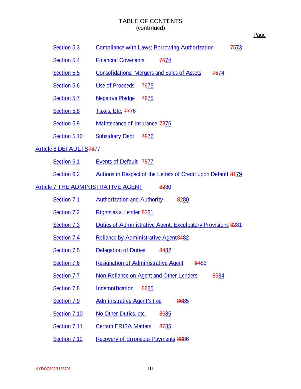 TABLE OF CONTENTS (continued) Page NYDOCS02/1166703 iii Section 5.3 Compliance with Laws; Borrowing Authorization 7573 Section 5.4 Financial Covenants 7574 Section 5.5 Consolidations, Mergers and Sales of Assets 7674 Section 5.6 Use of Proceeds 7675 Section 5.7 Negative Pledge 7675 Section 5.8 Taxes, Etc. 7776 Section 5.9 Maintenance of Insurance 7876 Section 5.10 Subsidiary Debt 7876 Article 6 DEFAULTS7877 Section 6.1 Events of Default 7877 Section 6.2 Actions in Respect of the Letters of Credit upon Default 8179 Article 7 THE ADMINISTRATIVE AGENT 8280 Section 7.1 Authorization and Authority 8280 Section 7.2 Rights as a Lender 8281 Section 7.3 Duties of Administrative Agent; Exculpatory Provisions 8281 Section 7.4 Reliance by Administrative Agent8482 Section 7.5 Delegation of Duties 8482 Section 7.6 Resignation of Administrative Agent 8483 Section 7.7 Non-Reliance on Agent and Other Lenders 8584 Section 7.8 Indemnification 8685 Section 7.9 Administrative Agent’s Fee 8685 Section 7.10 No Other Duties, etc. 8685 Section 7.11 Certain ERISA Matters 8785 Section 7.12 Recovery of Erroneous Payments 8886