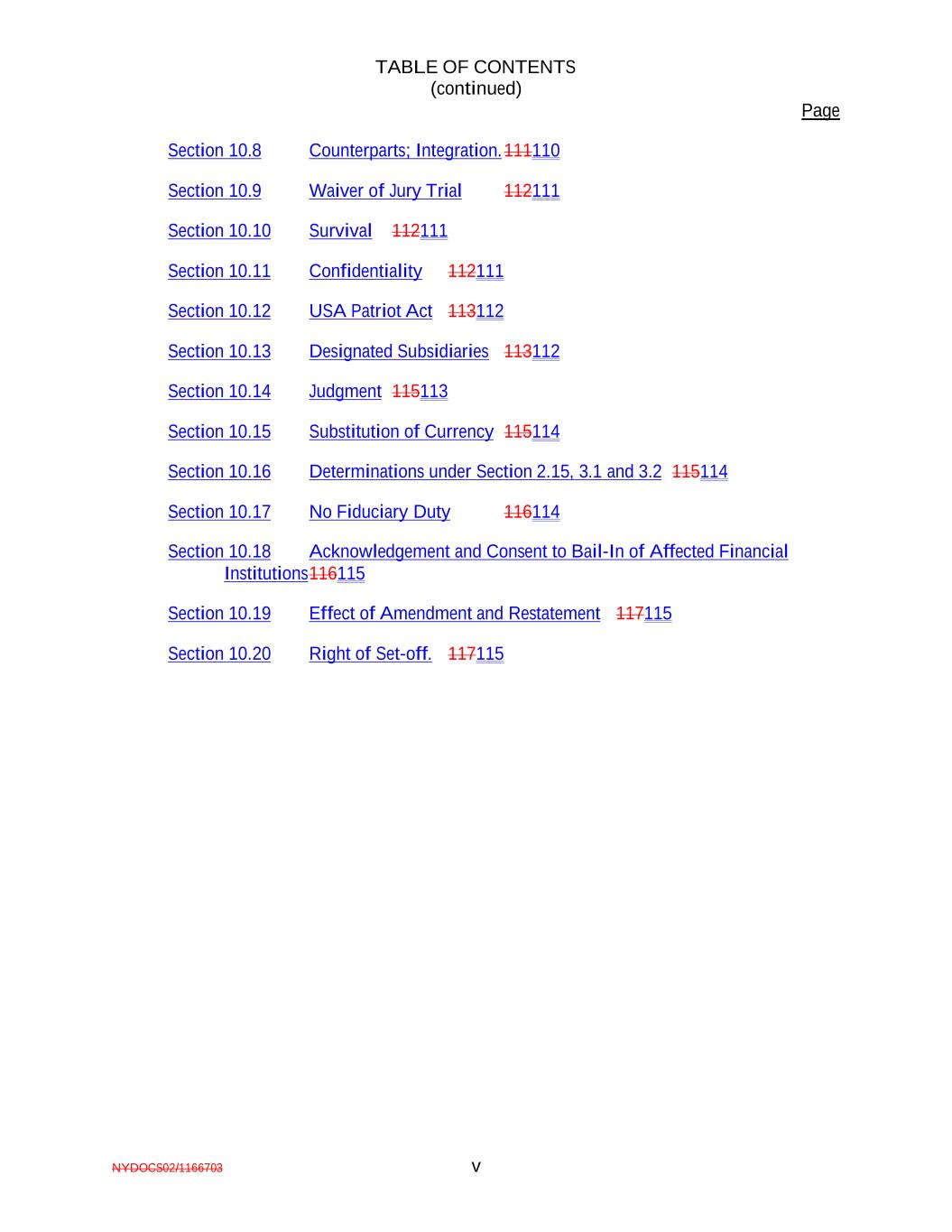 TABLE OF CONTENTS (continued) Page NYDOCS02/1166703 v Section 10.8 Counterparts; Integration.111110 Section 10.9 Waiver of Jury Trial 112111 Section 10.10 Survival 112111 Section 10.11 Confidentiality 112111 Section 10.12 USA Patriot Act 113112 Section 10.13 Designated Subsidiaries 113112 Section 10.14 Judgment 115113 Section 10.15 Substitution of Currency 115114 Section 10.16 Determinations under Section 2.15, 3.1 and 3.2 115114 Section 10.17 No Fiduciary Duty 116114 Section 10.18 Acknowledgement and Consent to Bail-In of Affected Financial Institutions116115 Section 10.19 Effect of Amendment and Restatement 117115 Section 10.20 Right of Set-off. 117115