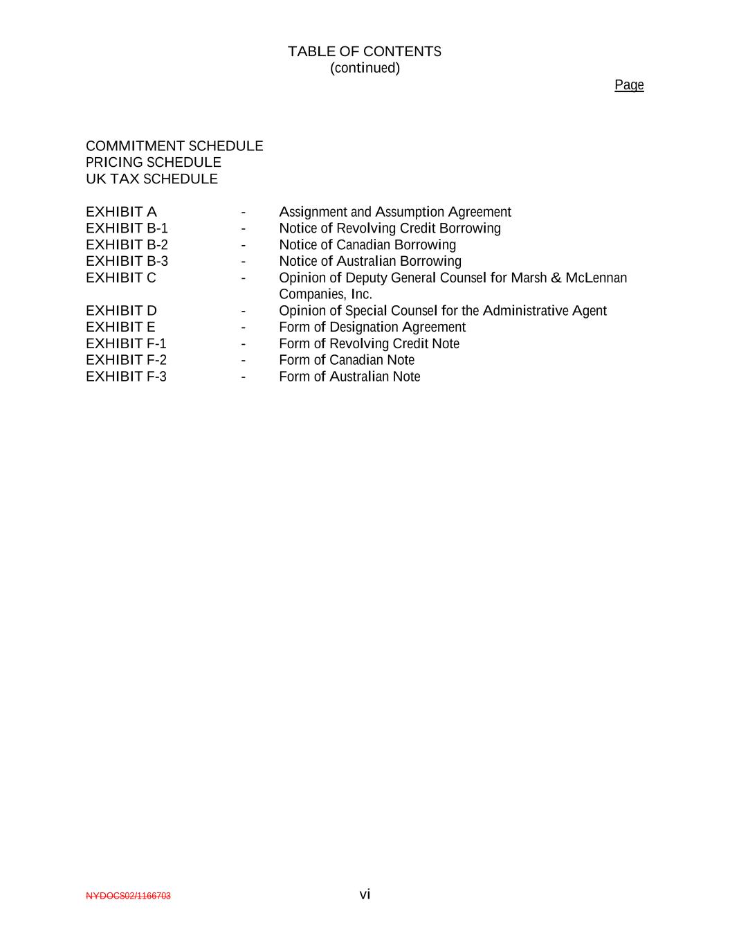 TABLE OF CONTENTS (continued) Page NYDOCS02/1166703 vi COMMITMENT SCHEDULE PRICING SCHEDULE UK TAX SCHEDULE EXHIBIT A - Assignment and Assumption Agreement EXHIBIT B-1 - Notice of Revolving Credit Borrowing EXHIBIT B-2 - Notice of Canadian Borrowing EXHIBIT B-3 - Notice of Australian Borrowing EXHIBIT C - Opinion of Deputy General Counsel for Marsh & McLennan Companies, Inc. EXHIBIT D - Opinion of Special Counsel for the Administrative Agent EXHIBIT E - Form of Designation Agreement EXHIBIT F-1 - Form of Revolving Credit Note EXHIBIT F-2 - Form of Canadian Note EXHIBIT F-3 - Form of Australian Note