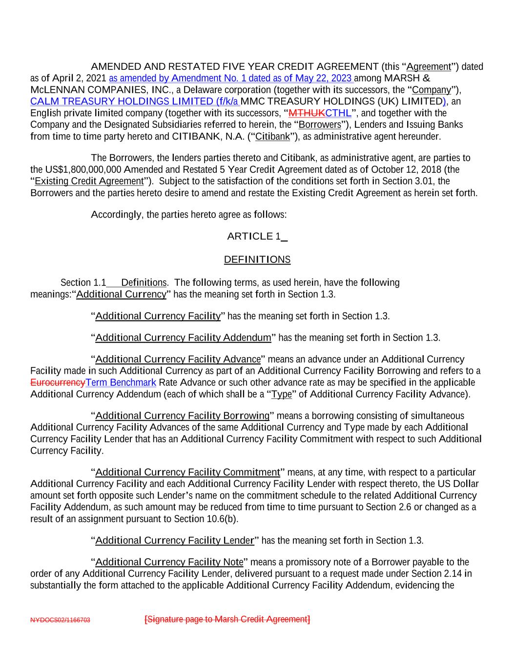 NYDOCS02/1166703 [Signature page to Marsh Credit Agreement] AMENDED AND RESTATED FIVE YEAR CREDIT AGREEMENT (this “Agreement”) dated as of April 2, 2021 as amended by Amendment No. 1 dated as of May 22, 2023 among MARSH & McLENNAN COMPANIES, INC., a Delaware corporation (together with its successors, the “Company”), CALM TREASURY HOLDINGS LIMITED (f/k/a MMC TREASURY HOLDINGS (UK) LIMITED), an English private limited company (together with its successors, “MTHUKCTHL”, and together with the Company and the Designated Subsidiaries referred to herein, the “Borrowers”), Lenders and Issuing Banks from time to time party hereto and CITIBANK, N.A. (“Citibank”), as administrative agent hereunder. The Borrowers, the lenders parties thereto and Citibank, as administrative agent, are parties to the US$1,800,000,000 Amended and Restated 5 Year Credit Agreement dated as of October 12, 2018 (the “Existing Credit Agreement”). Subject to the satisfaction of the conditions set forth in Section 3.01, the Borrowers and the parties hereto desire to amend and restate the Existing Credit Agreement as herein set forth. Accordingly, the parties hereto agree as follows: ARTICLE 1 DEFINITIONS Section 1.1 Definitions. The following terms, as used herein, have the following meanings:“Additional Currency” has the meaning set forth in Section 1.3. “Additional Currency Facility” has the meaning set forth in Section 1.3. “Additional Currency Facility Addendum” has the meaning set forth in Section 1.3. “Additional Currency Facility Advance” means an advance under an Additional Currency Facility made in such Additional Currency as part of an Additional Currency Facility Borrowing and refers to a EurocurrencyTerm Benchmark Rate Advance or such other advance rate as may be specified in the applicable Additional Currency Addendum (each of which shall be a “Type” of Additional Currency Facility Advance). “Additional Currency Facility Borrowing” means a borrowing consisting of simultaneous Additional Currency Facility Advances of the same Additional Currency and Type made by each Additional Currency Facility Lender that has an Additional Currency Facility Commitment with respect to such Additional Currency Facility. “Additional Currency Facility Commitment” means, at any time, with respect to a particular Additional Currency Facility and each Additional Currency Facility Lender with respect thereto, the US Dollar amount set forth opposite such Lender’s name on the commitment schedule to the related Additional Currency Facility Addendum, as such amount may be reduced from time to time pursuant to Section 2.6 or changed as a result of an assignment pursuant to Section 10.6(b). “Additional Currency Facility Lender” has the meaning set forth in Section 1.3. “Additional Currency Facility Note” means a promissory note of a Borrower payable to the order of any Additional Currency Facility Lender, delivered pursuant to a request made under Section 2.14 in substantially the form attached to the applicable Additional Currency Facility Addendum, evidencing the
