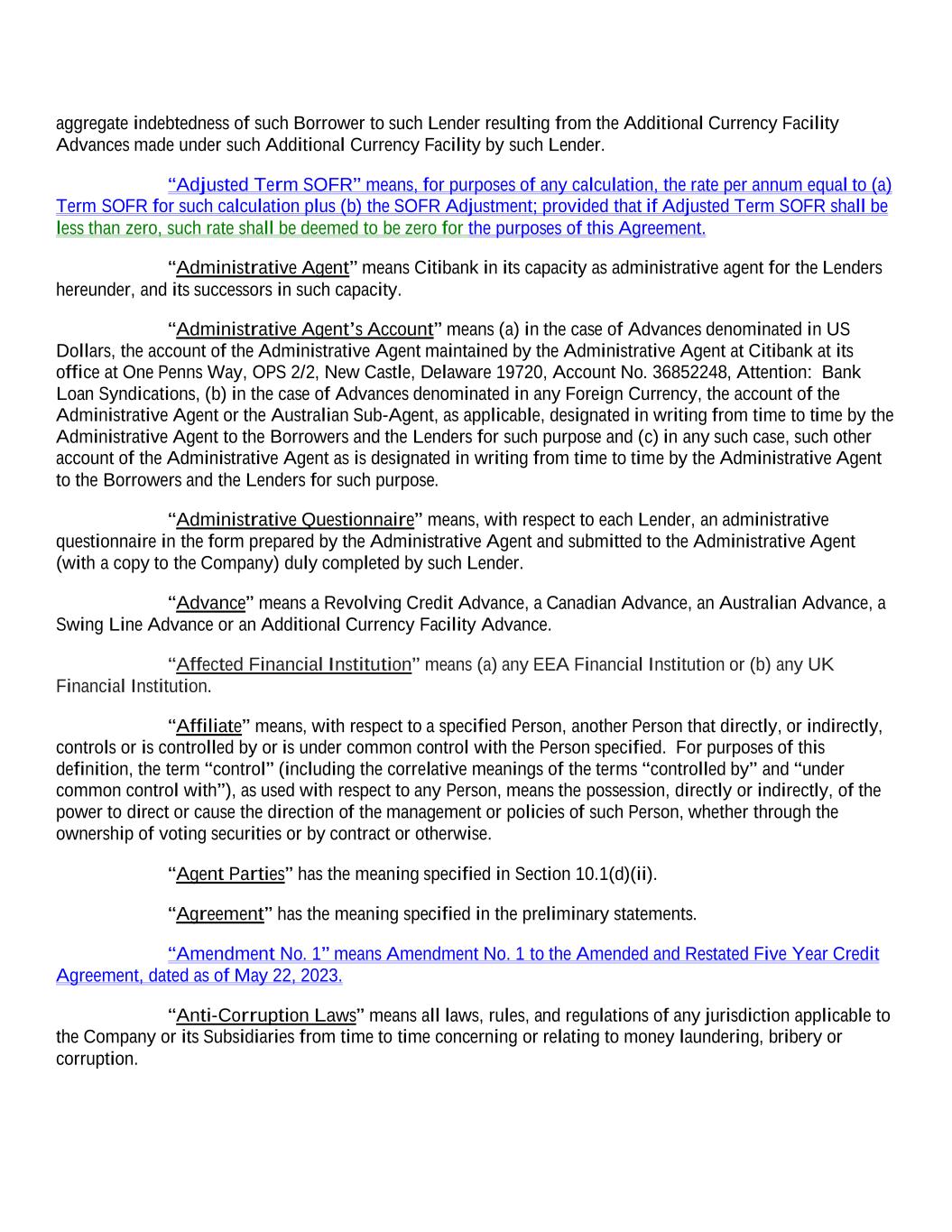 aggregate indebtedness of such Borrower to such Lender resulting from the Additional Currency Facility Advances made under such Additional Currency Facility by such Lender. “Adjusted Term SOFR” means, for purposes of any calculation, the rate per annum equal to (a) Term SOFR for such calculation plus (b) the SOFR Adjustment; provided that if Adjusted Term SOFR shall be less than zero, such rate shall be deemed to be zero for the purposes of this Agreement. “Administrative Agent” means Citibank in its capacity as administrative agent for the Lenders hereunder, and its successors in such capacity. “Administrative Agent’s Account” means (a) in the case of Advances denominated in US Dollars, the account of the Administrative Agent maintained by the Administrative Agent at Citibank at its office at One Penns Way, OPS 2/2, New Castle, Delaware 19720, Account No. 36852248, Attention: Bank Loan Syndications, (b) in the case of Advances denominated in any Foreign Currency, the account of the Administrative Agent or the Australian Sub-Agent, as applicable, designated in writing from time to time by the Administrative Agent to the Borrowers and the Lenders for such purpose and (c) in any such case, such other account of the Administrative Agent as is designated in writing from time to time by the Administrative Agent to the Borrowers and the Lenders for such purpose. “Administrative Questionnaire” means, with respect to each Lender, an administrative questionnaire in the form prepared by the Administrative Agent and submitted to the Administrative Agent (with a copy to the Company) duly completed by such Lender. “Advance” means a Revolving Credit Advance, a Canadian Advance, an Australian Advance, a Swing Line Advance or an Additional Currency Facility Advance. “Affected Financial Institution” means (a) any EEA Financial Institution or (b) any UK Financial Institution. “Affiliate” means, with respect to a specified Person, another Person that directly, or indirectly, controls or is controlled by or is under common control with the Person specified. For purposes of this definition, the term “control” (including the correlative meanings of the terms “controlled by” and “under common control with”), as used with respect to any Person, means the possession, directly or indirectly, of the power to direct or cause the direction of the management or policies of such Person, whether through the ownership of voting securities or by contract or otherwise. “Agent Parties” has the meaning specified in Section 10.1(d)(ii). “Agreement” has the meaning specified in the preliminary statements. “Amendment No. 1” means Amendment No. 1 to the Amended and Restated Five Year Credit Agreement, dated as of May 22, 2023. “Anti-Corruption Laws” means all laws, rules, and regulations of any jurisdiction applicable to the Company or its Subsidiaries from time to time concerning or relating to money laundering, bribery or corruption.