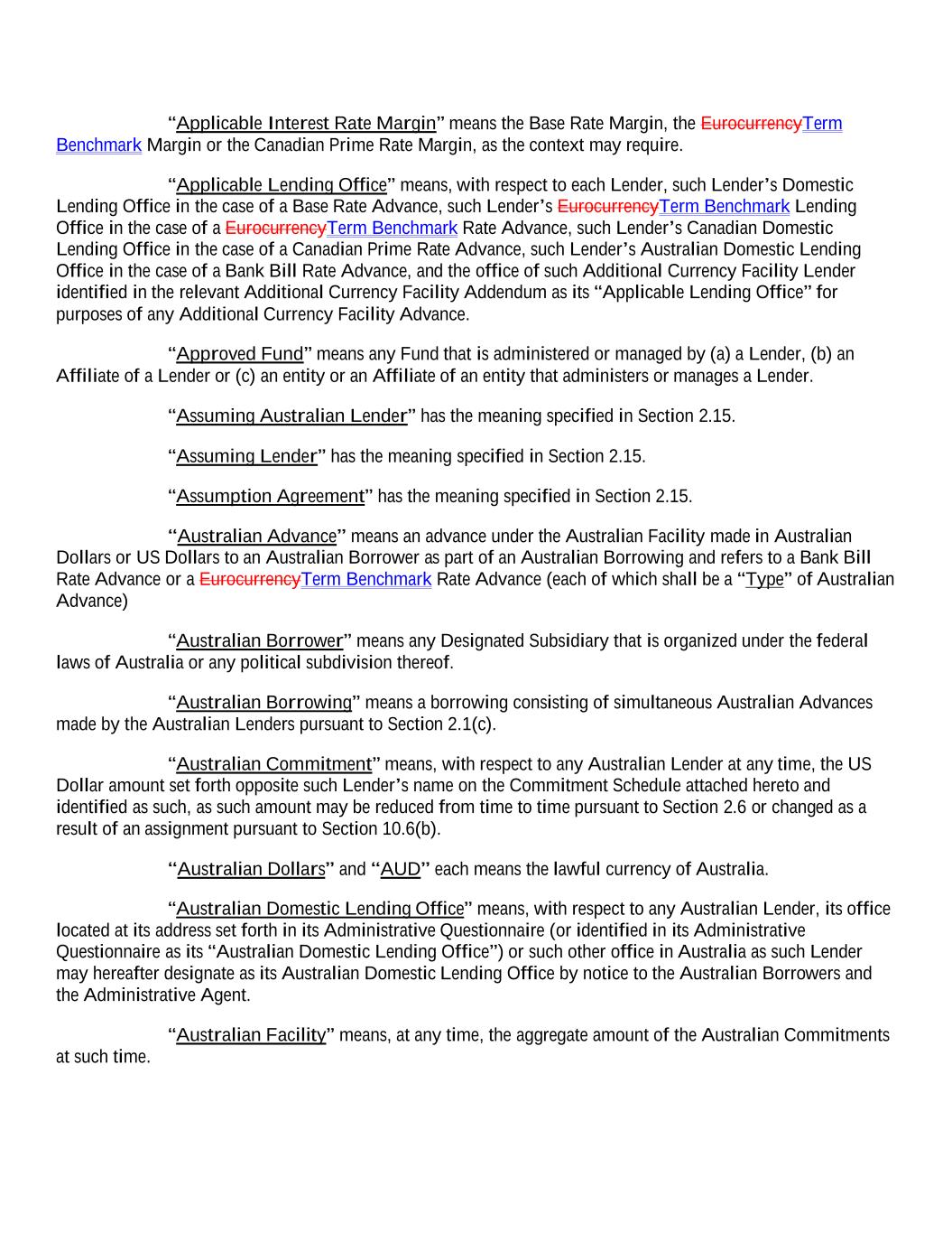 “Applicable Interest Rate Margin” means the Base Rate Margin, the EurocurrencyTerm Benchmark Margin or the Canadian Prime Rate Margin, as the context may require. “Applicable Lending Office” means, with respect to each Lender, such Lender’s Domestic Lending Office in the case of a Base Rate Advance, such Lender’s EurocurrencyTerm Benchmark Lending Office in the case of a EurocurrencyTerm Benchmark Rate Advance, such Lender’s Canadian Domestic Lending Office in the case of a Canadian Prime Rate Advance, such Lender’s Australian Domestic Lending Office in the case of a Bank Bill Rate Advance, and the office of such Additional Currency Facility Lender identified in the relevant Additional Currency Facility Addendum as its “Applicable Lending Office” for purposes of any Additional Currency Facility Advance. “Approved Fund” means any Fund that is administered or managed by (a) a Lender, (b) an Affiliate of a Lender or (c) an entity or an Affiliate of an entity that administers or manages a Lender. “Assuming Australian Lender” has the meaning specified in Section 2.15. “Assuming Lender” has the meaning specified in Section 2.15. “Assumption Agreement” has the meaning specified in Section 2.15. “Australian Advance” means an advance under the Australian Facility made in Australian Dollars or US Dollars to an Australian Borrower as part of an Australian Borrowing and refers to a Bank Bill Rate Advance or a EurocurrencyTerm Benchmark Rate Advance (each of which shall be a “Type” of Australian Advance) “Australian Borrower” means any Designated Subsidiary that is organized under the federal laws of Australia or any political subdivision thereof. “Australian Borrowing” means a borrowing consisting of simultaneous Australian Advances made by the Australian Lenders pursuant to Section 2.1(c). “Australian Commitment” means, with respect to any Australian Lender at any time, the US Dollar amount set forth opposite such Lender’s name on the Commitment Schedule attached hereto and identified as such, as such amount may be reduced from time to time pursuant to Section 2.6 or changed as a result of an assignment pursuant to Section 10.6(b). “Australian Dollars” and “AUD” each means the lawful currency of Australia. “Australian Domestic Lending Office” means, with respect to any Australian Lender, its office located at its address set forth in its Administrative Questionnaire (or identified in its Administrative Questionnaire as its “Australian Domestic Lending Office”) or such other office in Australia as such Lender may hereafter designate as its Australian Domestic Lending Office by notice to the Australian Borrowers and the Administrative Agent. “Australian Facility” means, at any time, the aggregate amount of the Australian Commitments at such time.