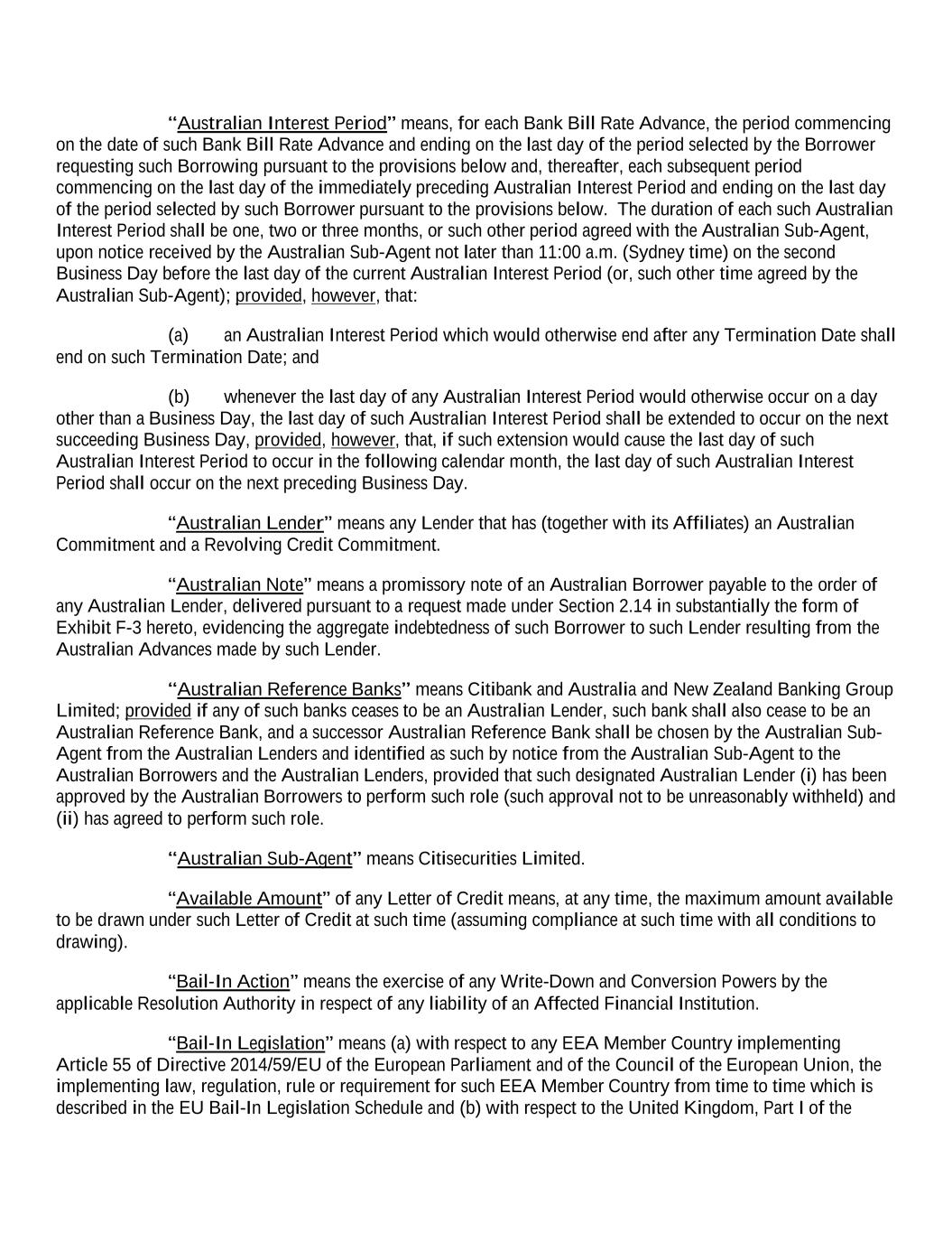 “Australian Interest Period” means, for each Bank Bill Rate Advance, the period commencing on the date of such Bank Bill Rate Advance and ending on the last day of the period selected by the Borrower requesting such Borrowing pursuant to the provisions below and, thereafter, each subsequent period commencing on the last day of the immediately preceding Australian Interest Period and ending on the last day of the period selected by such Borrower pursuant to the provisions below. The duration of each such Australian Interest Period shall be one, two or three months, or such other period agreed with the Australian Sub-Agent, upon notice received by the Australian Sub-Agent not later than 11:00 a.m. (Sydney time) on the second Business Day before the last day of the current Australian Interest Period (or, such other time agreed by the Australian Sub-Agent); provided, however, that: (a) an Australian Interest Period which would otherwise end after any Termination Date shall end on such Termination Date; and (b) whenever the last day of any Australian Interest Period would otherwise occur on a day other than a Business Day, the last day of such Australian Interest Period shall be extended to occur on the next succeeding Business Day, provided, however, that, if such extension would cause the last day of such Australian Interest Period to occur in the following calendar month, the last day of such Australian Interest Period shall occur on the next preceding Business Day. “Australian Lender” means any Lender that has (together with its Affiliates) an Australian Commitment and a Revolving Credit Commitment. “Australian Note” means a promissory note of an Australian Borrower payable to the order of any Australian Lender, delivered pursuant to a request made under Section 2.14 in substantially the form of Exhibit F-3 hereto, evidencing the aggregate indebtedness of such Borrower to such Lender resulting from the Australian Advances made by such Lender. “Australian Reference Banks” means Citibank and Australia and New Zealand Banking Group Limited; provided if any of such banks ceases to be an Australian Lender, such bank shall also cease to be an Australian Reference Bank, and a successor Australian Reference Bank shall be chosen by the Australian Sub- Agent from the Australian Lenders and identified as such by notice from the Australian Sub-Agent to the Australian Borrowers and the Australian Lenders, provided that such designated Australian Lender (i) has been approved by the Australian Borrowers to perform such role (such approval not to be unreasonably withheld) and (ii) has agreed to perform such role. “Australian Sub-Agent” means Citisecurities Limited. “Available Amount” of any Letter of Credit means, at any time, the maximum amount available to be drawn under such Letter of Credit at such time (assuming compliance at such time with all conditions to drawing). “Bail-In Action” means the exercise of any Write-Down and Conversion Powers by the applicable Resolution Authority in respect of any liability of an Affected Financial Institution. “Bail-In Legislation” means (a) with respect to any EEA Member Country implementing Article 55 of Directive 2014/59/EU of the European Parliament and of the Council of the European Union, the implementing law, regulation, rule or requirement for such EEA Member Country from time to time which is described in the EU Bail-In Legislation Schedule and (b) with respect to the United Kingdom, Part I of the