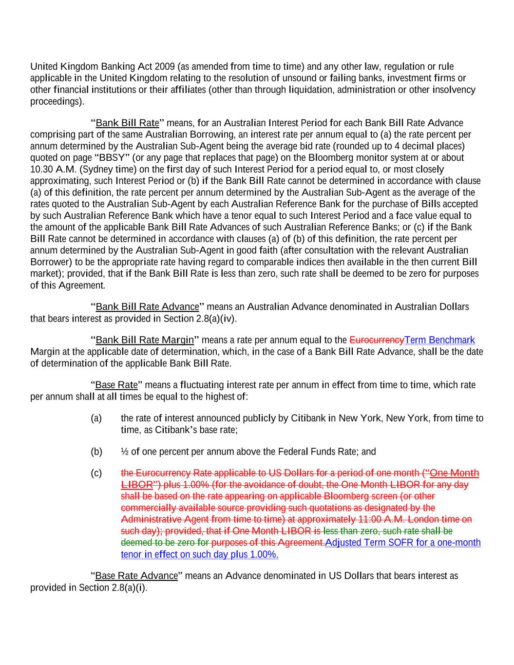 United Kingdom Banking Act 2009 (as amended from time to time) and any other law, regulation or rule applicable in the United Kingdom relating to the resolution of unsound or failing banks, investment firms or other financial institutions or their affiliates (other than through liquidation, administration or other insolvency proceedings). “Bank Bill Rate” means, for an Australian Interest Period for each Bank Bill Rate Advance comprising part of the same Australian Borrowing, an interest rate per annum equal to (a) the rate percent per annum determined by the Australian Sub-Agent being the average bid rate (rounded up to 4 decimal places) quoted on page “BBSY” (or any page that replaces that page) on the Bloomberg monitor system at or about 10.30 A.M. (Sydney time) on the first day of such Interest Period for a period equal to, or most closely approximating, such Interest Period or (b) if the Bank Bill Rate cannot be determined in accordance with clause (a) of this definition, the rate percent per annum determined by the Australian Sub-Agent as the average of the rates quoted to the Australian Sub-Agent by each Australian Reference Bank for the purchase of Bills accepted by such Australian Reference Bank which have a tenor equal to such Interest Period and a face value equal to the amount of the applicable Bank Bill Rate Advances of such Australian Reference Banks; or (c) if the Bank Bill Rate cannot be determined in accordance with clauses (a) of (b) of this definition, the rate percent per annum determined by the Australian Sub-Agent in good faith (after consultation with the relevant Australian Borrower) to be the appropriate rate having regard to comparable indices then available in the then current Bill market); provided, that if the Bank Bill Rate is less than zero, such rate shall be deemed to be zero for purposes of this Agreement. “Bank Bill Rate Advance” means an Australian Advance denominated in Australian Dollars that bears interest as provided in Section 2.8(a)(iv). “Bank Bill Rate Margin” means a rate per annum equal to the EurocurrencyTerm Benchmark Margin at the applicable date of determination, which, in the case of a Bank Bill Rate Advance, shall be the date of determination of the applicable Bank Bill Rate. “Base Rate” means a fluctuating interest rate per annum in effect from time to time, which rate per annum shall at all times be equal to the highest of: (a) the rate of interest announced publicly by Citibank in New York, New York, from time to time, as Citibank’s base rate; (b) ½ of one percent per annum above the Federal Funds Rate; and (c) the Eurocurrency Rate applicable to US Dollars for a period of one month (“One Month LIBOR”) plus 1.00% (for the avoidance of doubt, the One Month LIBOR for any day shall be based on the rate appearing on applicable Bloomberg screen (or other commercially available source providing such quotations as designated by the Administrative Agent from time to time) at approximately 11:00 A.M. London time on such day); provided, that if One Month LIBOR is less than zero, such rate shall be deemed to be zero for purposes of this Agreement.Adjusted Term SOFR for a one-month tenor in effect on such day plus 1.00%. “Base Rate Advance” means an Advance denominated in US Dollars that bears interest as provided in Section 2.8(a)(i).