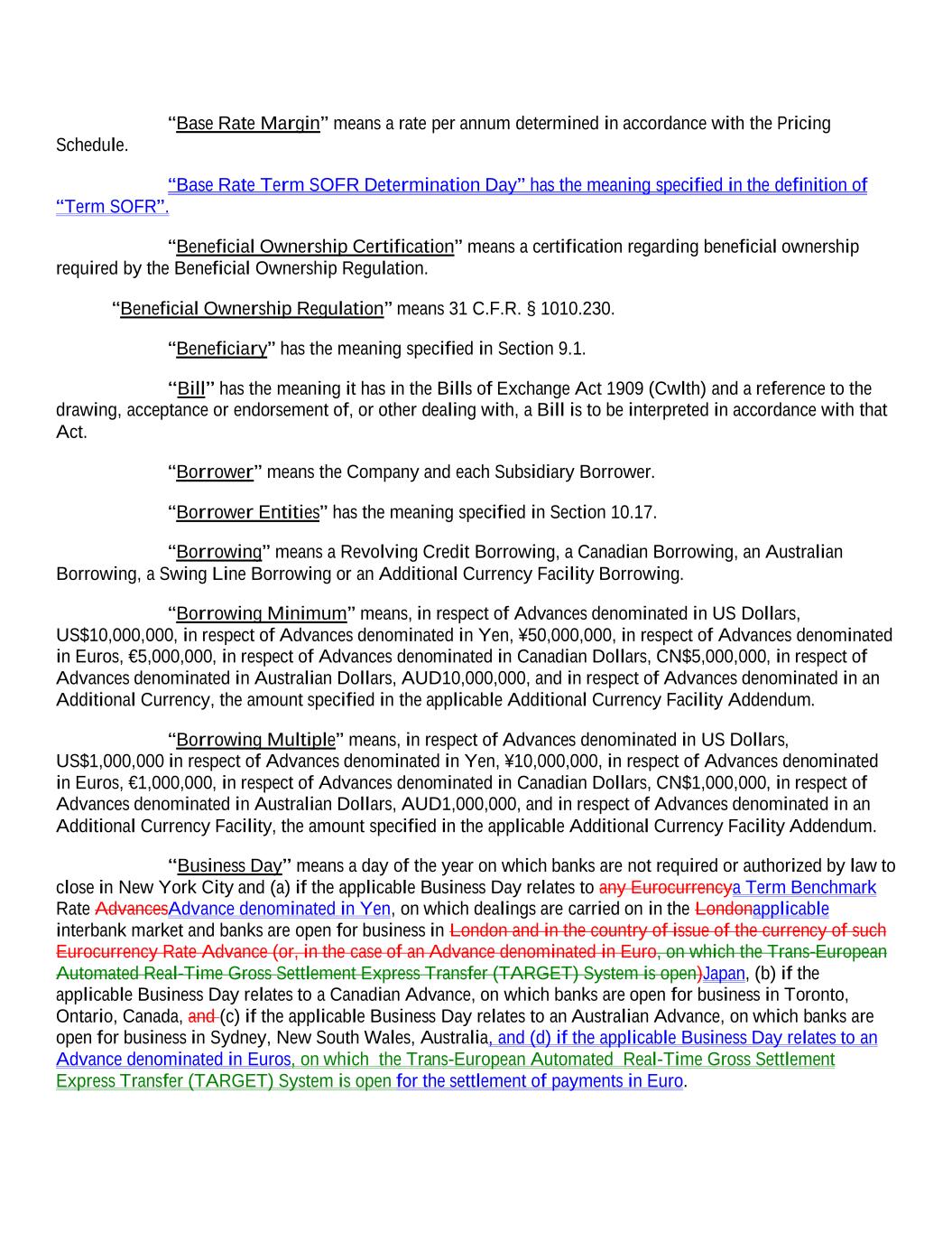 “Base Rate Margin” means a rate per annum determined in accordance with the Pricing Schedule. “Base Rate Term SOFR Determination Day” has the meaning specified in the definition of “Term SOFR”. “Beneficial Ownership Certification” means a certification regarding beneficial ownership required by the Beneficial Ownership Regulation. “Beneficial Ownership Regulation” means 31 C.F.R. § 1010.230. “Beneficiary” has the meaning specified in Section 9.1. “Bill” has the meaning it has in the Bills of Exchange Act 1909 (Cwlth) and a reference to the drawing, acceptance or endorsement of, or other dealing with, a Bill is to be interpreted in accordance with that Act. “Borrower” means the Company and each Subsidiary Borrower. “Borrower Entities” has the meaning specified in Section 10.17. “Borrowing” means a Revolving Credit Borrowing, a Canadian Borrowing, an Australian Borrowing, a Swing Line Borrowing or an Additional Currency Facility Borrowing. “Borrowing Minimum” means, in respect of Advances denominated in US Dollars, US$10,000,000, in respect of Advances denominated in Yen, ¥50,000,000, in respect of Advances denominated in Euros, €5,000,000, in respect of Advances denominated in Canadian Dollars, CN$5,000,000, in respect of Advances denominated in Australian Dollars, AUD10,000,000, and in respect of Advances denominated in an Additional Currency, the amount specified in the applicable Additional Currency Facility Addendum. “Borrowing Multiple” means, in respect of Advances denominated in US Dollars, US$1,000,000 in respect of Advances denominated in Yen, ¥10,000,000, in respect of Advances denominated in Euros, €1,000,000, in respect of Advances denominated in Canadian Dollars, CN$1,000,000, in respect of Advances denominated in Australian Dollars, AUD1,000,000, and in respect of Advances denominated in an Additional Currency Facility, the amount specified in the applicable Additional Currency Facility Addendum. “Business Day” means a day of the year on which banks are not required or authorized by law to close in New York City and (a) if the applicable Business Day relates to any Eurocurrencya Term Benchmark Rate AdvancesAdvance denominated in Yen, on which dealings are carried on in the Londonapplicable interbank market and banks are open for business in London and in the country of issue of the currency of such Eurocurrency Rate Advance (or, in the case of an Advance denominated in Euro, on which the Trans-European Automated Real-Time Gross Settlement Express Transfer (TARGET) System is open)Japan, (b) if the applicable Business Day relates to a Canadian Advance, on which banks are open for business in Toronto, Ontario, Canada, and (c) if the applicable Business Day relates to an Australian Advance, on which banks are open for business in Sydney, New South Wales, Australia, and (d) if the applicable Business Day relates to an Advance denominated in Euros, on which the Trans-European Automated Real-Time Gross Settlement Express Transfer (TARGET) System is open for the settlement of payments in Euro.