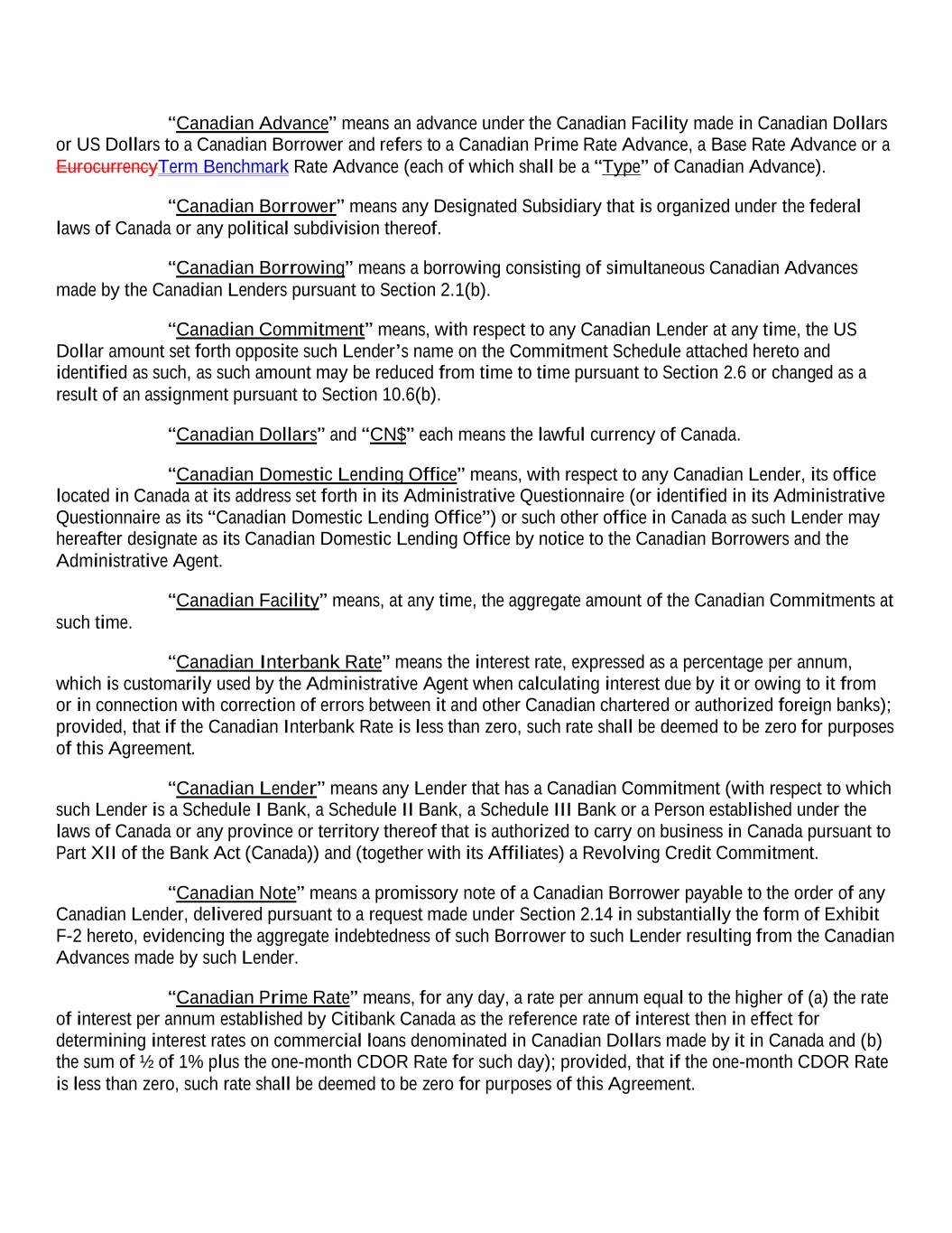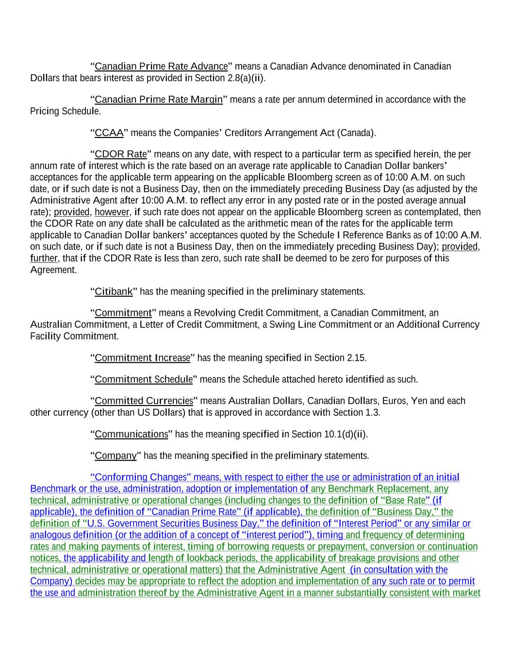 “Canadian Prime Rate Advance” means a Canadian Advance denominated in Canadian Dollars that bears interest as provided in Section 2.8(a)(ii). “Canadian Prime Rate Margin” means a rate per annum determined in accordance with the Pricing Schedule. “CCAA” means the Companies’ Creditors Arrangement Act (Canada). “CDOR Rate” means on any date, with respect to a particular term as specified herein, the per annum rate of interest which is the rate based on an average rate applicable to Canadian Dollar bankers’ acceptances for the applicable term appearing on the applicable Bloomberg screen as of 10:00 A.M. on such date, or if such date is not a Business Day, then on the immediately preceding Business Day (as adjusted by the Administrative Agent after 10:00 A.M. to reflect any error in any posted rate or in the posted average annual rate); provided, however, if such rate does not appear on the applicable Bloomberg screen as contemplated, then the CDOR Rate on any date shall be calculated as the arithmetic mean of the rates for the applicable term applicable to Canadian Dollar bankers’ acceptances quoted by the Schedule I Reference Banks as of 10:00 A.M. on such date, or if such date is not a Business Day, then on the immediately preceding Business Day); provided, further, that if the CDOR Rate is less than zero, such rate shall be deemed to be zero for purposes of this Agreement. “Citibank” has the meaning specified in the preliminary statements. “Commitment” means a Revolving Credit Commitment, a Canadian Commitment, an Australian Commitment, a Letter of Credit Commitment, a Swing Line Commitment or an Additional Currency Facility Commitment. “Commitment Increase” has the meaning specified in Section 2.15. “Commitment Schedule” means the Schedule attached hereto identified as such. “Committed Currencies” means Australian Dollars, Canadian Dollars, Euros, Yen and each other currency (other than US Dollars) that is approved in accordance with Section 1.3. “Communications” has the meaning specified in Section 10.1(d)(ii). “Company” has the meaning specified in the preliminary statements. “Conforming Changes” means, with respect to either the use or administration of an initial Benchmark or the use, administration, adoption or implementation of any Benchmark Replacement, any technical, administrative or operational changes (including changes to the definition of “Base Rate” (if applicable), the definition of “Canadian Prime Rate” (if applicable), the definition of “Business Day,” the definition of “U.S. Government Securities Business Day,” the definition of “Interest Period” or any similar or analogous definition (or the addition of a concept of “interest period”), timing and frequency of determining rates and making payments of interest, timing of borrowing requests or prepayment, conversion or continuation notices, the applicability and length of lookback periods, the applicability of breakage provisions and other technical, administrative or operational matters) that the Administrative Agent (in consultation with the Company) decides may be appropriate to reflect the adoption and implementation of any such rate or to permit the use and administration thereof by the Administrative Agent in a manner substantially consistent with market
