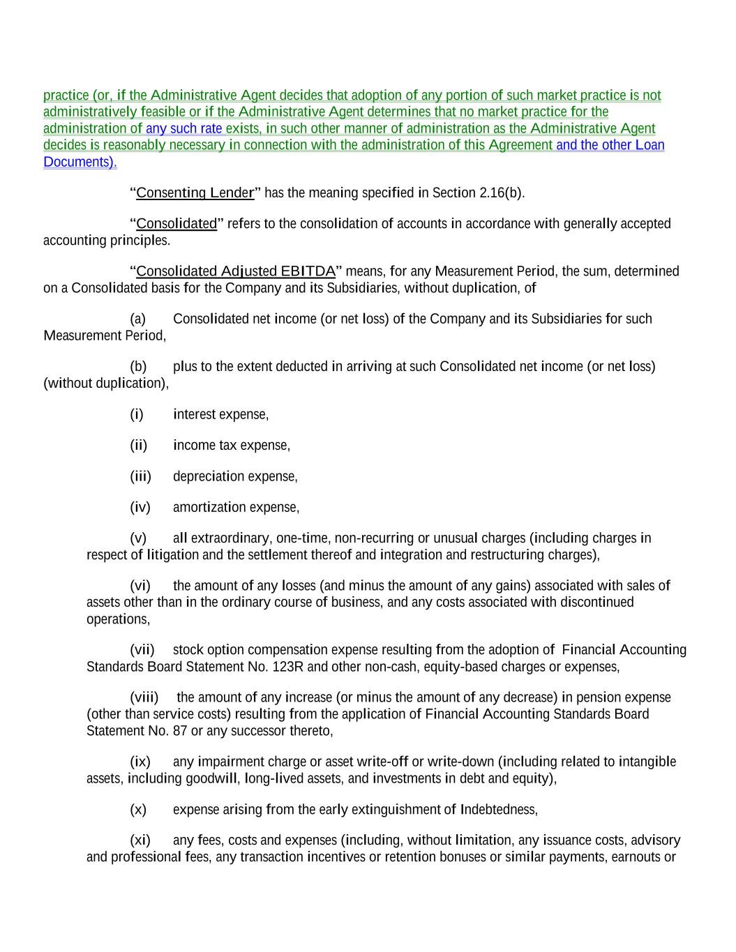 practice (or, if the Administrative Agent decides that adoption of any portion of such market practice is not administratively feasible or if the Administrative Agent determines that no market practice for the administration of any such rate exists, in such other manner of administration as the Administrative Agent decides is reasonably necessary in connection with the administration of this Agreement and the other Loan Documents). “Consenting Lender” has the meaning specified in Section 2.16(b). “Consolidated” refers to the consolidation of accounts in accordance with generally accepted accounting principles. “Consolidated Adjusted EBITDA” means, for any Measurement Period, the sum, determined on a Consolidated basis for the Company and its Subsidiaries, without duplication, of (a) Consolidated net income (or net loss) of the Company and its Subsidiaries for such Measurement Period, (b) plus to the extent deducted in arriving at such Consolidated net income (or net loss) (without duplication), (i) interest expense, (ii) income tax expense, (iii) depreciation expense, (iv) amortization expense, (v) all extraordinary, one-time, non-recurring or unusual charges (including charges in respect of litigation and the settlement thereof and integration and restructuring charges), (vi) the amount of any losses (and minus the amount of any gains) associated with sales of assets other than in the ordinary course of business, and any costs associated with discontinued operations, (vii) stock option compensation expense resulting from the adoption of Financial Accounting Standards Board Statement No. 123R and other non-cash, equity-based charges or expenses, (viii) the amount of any increase (or minus the amount of any decrease) in pension expense (other than service costs) resulting from the application of Financial Accounting Standards Board Statement No. 87 or any successor thereto, (ix) any impairment charge or asset write-off or write-down (including related to intangible assets, including goodwill, long-lived assets, and investments in debt and equity), (x) expense arising from the early extinguishment of Indebtedness, (xi) any fees, costs and expenses (including, without limitation, any issuance costs, advisory and professional fees, any transaction incentives or retention bonuses or similar payments, earnouts or