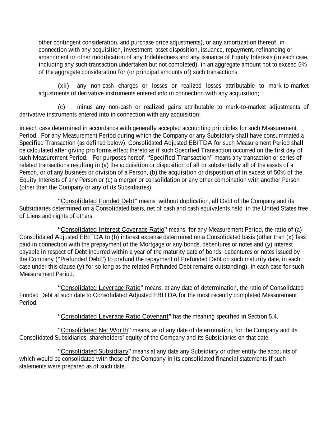 other contingent consideration, and purchase price adjustments), or any amortization thereof, in connection with any acquisition, investment, asset disposition, issuance, repayment, refinancing or amendment or other modification of any Indebtedness and any issuance of Equity Interests (in each case, including any such transaction undertaken but not completed), in an aggregate amount not to exceed 5% of the aggregate consideration for (or principal amounts of) such transactions, (xii) any non-cash charges or losses or realized losses attributable to mark-to-market adjustments of derivative instruments entered into in connection with any acquisition; (c) minus any non-cash or realized gains attributable to mark-to-market adjustments of derivative instruments entered into in connection with any acquisition; in each case determined in accordance with generally accepted accounting principles for such Measurement Period. For any Measurement Period during which the Company or any Subsidiary shall have consummated a Specified Transaction (as defined below), Consolidated Adjusted EBITDA for such Measurement Period shall be calculated after giving pro forma effect thereto as if such Specified Transaction occurred on the first day of such Measurement Period. For purposes hereof, “Specified Transaction” means any transaction or series of related transactions resulting in (a) the acquisition or disposition of all or substantially all of the assets of a Person, or of any business or division of a Person, (b) the acquisition or disposition of in excess of 50% of the Equity Interests of any Person or (c) a merger or consolidation or any other combination with another Person (other than the Company or any of its Subsidiaries). “Consolidated Funded Debt” means, without duplication, all Debt of the Company and its Subsidiaries determined on a Consolidated basis, net of cash and cash equivalents held in the United States free of Liens and rights of others. “Consolidated Interest Coverage Ratio” means, for any Measurement Period, the ratio of (a) Consolidated Adjusted EBITDA to (b) interest expense determined on a Consolidated basis (other than (x) fees paid in connection with the prepayment of the Mortgage or any bonds, debentures or notes and (y) interest payable in respect of Debt incurred within a year of the maturity date of bonds, debentures or notes issued by the Company (“Prefunded Debt”) to prefund the repayment of Prefunded Debt on such maturity date, in each case under this clause (y) for so long as the related Prefunded Debt remains outstanding), in each case for such Measurement Period. “Consolidated Leverage Ratio” means, at any date of determination, the ratio of Consolidated Funded Debt at such date to Consolidated Adjusted EBITDA for the most recently completed Measurement Period. “Consolidated Leverage Ratio Covenant” has the meaning specified in Section 5.4. “Consolidated Net Worth” means, as of any date of determination, for the Company and its Consolidated Subsidiaries, shareholders’ equity of the Company and its Subsidiaries on that date. “Consolidated Subsidiary” means at any date any Subsidiary or other entity the accounts of which would be consolidated with those of the Company in its consolidated financial statements if such statements were prepared as of such date.