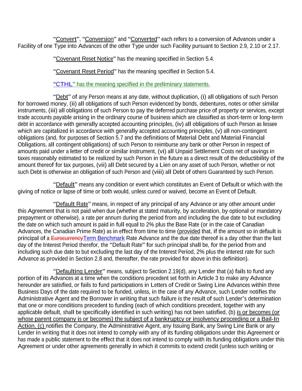 “Convert”, “Conversion” and “Converted” each refers to a conversion of Advances under a Facility of one Type into Advances of the other Type under such Facility pursuant to Section 2.9, 2.10 or 2.17. “Covenant Reset Notice” has the meaning specified in Section 5.4. “Covenant Reset Period” has the meaning specified in Section 5.4. “CTHL” has the meaning specified in the preliminary statements. “Debt” of any Person means at any date, without duplication, (i) all obligations of such Person for borrowed money, (ii) all obligations of such Person evidenced by bonds, debentures, notes or other similar instruments, (iii) all obligations of such Person to pay the deferred purchase price of property or services, except trade accounts payable arising in the ordinary course of business which are classified as short-term or long-term debt in accordance with generally accepted accounting principles, (iv) all obligations of such Person as lessee which are capitalized in accordance with generally accepted accounting principles, (v) all non-contingent obligations (and, for purposes of Section 5.7 and the definitions of Material Debt and Material Financial Obligations, all contingent obligations) of such Person to reimburse any bank or other Person in respect of amounts paid under a letter of credit or similar instrument, (vi) all Unpaid Settlement Costs net of savings in taxes reasonably estimated to be realized by such Person in the future as a direct result of the deductibility of the amount thereof for tax purposes, (vii) all Debt secured by a Lien on any asset of such Person, whether or not such Debt is otherwise an obligation of such Person and (viii) all Debt of others Guaranteed by such Person. “Default” means any condition or event which constitutes an Event of Default or which with the giving of notice or lapse of time or both would, unless cured or waived, become an Event of Default. “Default Rate” means, in respect of any principal of any Advance or any other amount under this Agreement that is not paid when due (whether at stated maturity, by acceleration, by optional or mandatory prepayment or otherwise), a rate per annum during the period from and including the due date to but excluding the date on which such amount is paid in full equal to 2% plus the Base Rate (or in the case of Canadian Advances, the Canadian Prime Rate) as in effect from time to time (provided that, if the amount so in default is principal of a EurocurrencyTerm Benchmark Rate Advance and the due date thereof is a day other than the last day of the Interest Period therefor, the “Default Rate” for such principal shall be, for the period from and including such due date to but excluding the last day of the Interest Period, 2% plus the interest rate for such Advance as provided in Section 2.8 and, thereafter, the rate provided for above in this definition). “Defaulting Lender” means, subject to Section 2.19(d), any Lender that (a) fails to fund any portion of its Advances at a time when the conditions precedent set forth in Article 3 to make any Advance hereunder are satisfied, or fails to fund participations in Letters of Credit or Swing Line Advances within three Business Days of the date required to be funded, unless, in the case of any Advance, such Lender notifies the Administrative Agent and the Borrower in writing that such failure is the result of such Lender’s determination that one or more conditions precedent to funding (each of which conditions precedent, together with any applicable default, shall be specifically identified in such writing) has not been satisfied, (b) is or becomes (or whose parent company is or becomes) the subject of a bankruptcy or insolvency proceeding or a Bail-In Action, (c) notifies the Company, the Administrative Agent, any Issuing Bank, any Swing Line Bank or any Lender in writing that it does not intend to comply with any of its funding obligations under this Agreement or has made a public statement to the effect that it does not intend to comply with its funding obligations under this Agreement or under other agreements generally in which it commits to extend credit (unless such writing or