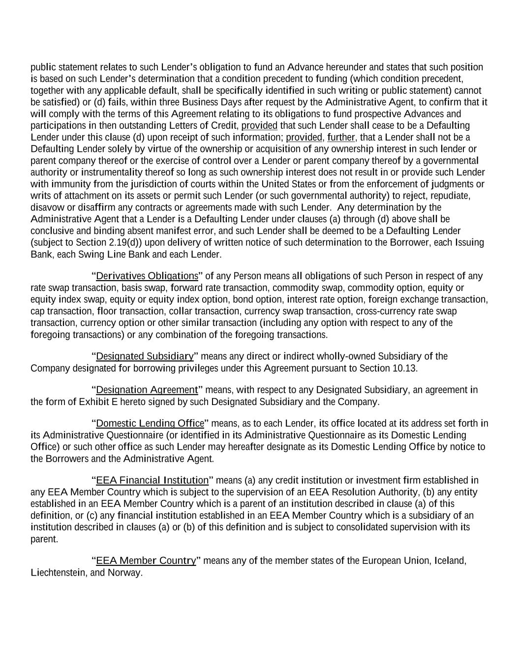 public statement relates to such Lender’s obligation to fund an Advance hereunder and states that such position is based on such Lender’s determination that a condition precedent to funding (which condition precedent, together with any applicable default, shall be specifically identified in such writing or public statement) cannot be satisfied) or (d) fails, within three Business Days after request by the Administrative Agent, to confirm that it will comply with the terms of this Agreement relating to its obligations to fund prospective Advances and participations in then outstanding Letters of Credit, provided that such Lender shall cease to be a Defaulting Lender under this clause (d) upon receipt of such information; provided, further, that a Lender shall not be a Defaulting Lender solely by virtue of the ownership or acquisition of any ownership interest in such lender or parent company thereof or the exercise of control over a Lender or parent company thereof by a governmental authority or instrumentality thereof so long as such ownership interest does not result in or provide such Lender with immunity from the jurisdiction of courts within the United States or from the enforcement of judgments or writs of attachment on its assets or permit such Lender (or such governmental authority) to reject, repudiate, disavow or disaffirm any contracts or agreements made with such Lender. Any determination by the Administrative Agent that a Lender is a Defaulting Lender under clauses (a) through (d) above shall be conclusive and binding absent manifest error, and such Lender shall be deemed to be a Defaulting Lender (subject to Section 2.19(d)) upon delivery of written notice of such determination to the Borrower, each Issuing Bank, each Swing Line Bank and each Lender. “Derivatives Obligations” of any Person means all obligations of such Person in respect of any rate swap transaction, basis swap, forward rate transaction, commodity swap, commodity option, equity or equity index swap, equity or equity index option, bond option, interest rate option, foreign exchange transaction, cap transaction, floor transaction, collar transaction, currency swap transaction, cross-currency rate swap transaction, currency option or other similar transaction (including any option with respect to any of the foregoing transactions) or any combination of the foregoing transactions. “Designated Subsidiary” means any direct or indirect wholly-owned Subsidiary of the Company designated for borrowing privileges under this Agreement pursuant to Section 10.13. “Designation Agreement” means, with respect to any Designated Subsidiary, an agreement in the form of Exhibit E hereto signed by such Designated Subsidiary and the Company. “Domestic Lending Office” means, as to each Lender, its office located at its address set forth in its Administrative Questionnaire (or identified in its Administrative Questionnaire as its Domestic Lending Office) or such other office as such Lender may hereafter designate as its Domestic Lending Office by notice to the Borrowers and the Administrative Agent. “EEA Financial Institution” means (a) any credit institution or investment firm established in any EEA Member Country which is subject to the supervision of an EEA Resolution Authority, (b) any entity established in an EEA Member Country which is a parent of an institution described in clause (a) of this definition, or (c) any financial institution established in an EEA Member Country which is a subsidiary of an institution described in clauses (a) or (b) of this definition and is subject to consolidated supervision with its parent. “EEA Member Country” means any of the member states of the European Union, Iceland, Liechtenstein, and Norway.