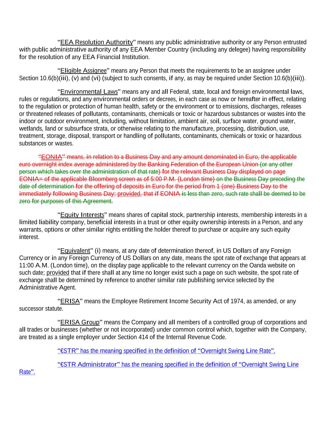 “EEA Resolution Authority” means any public administrative authority or any Person entrusted with public administrative authority of any EEA Member Country (including any delegee) having responsibility for the resolution of any EEA Financial Institution. “Eligible Assignee” means any Person that meets the requirements to be an assignee under Section 10.6(b)(iii), (v) and (vi) (subject to such consents, if any, as may be required under Section 10.6(b)(iii)). “Environmental Laws” means any and all Federal, state, local and foreign environmental laws, rules or regulations, and any environmental orders or decrees, in each case as now or hereafter in effect, relating to the regulation or protection of human health, safety or the environment or to emissions, discharges, releases or threatened releases of pollutants, contaminants, chemicals or toxic or hazardous substances or wastes into the indoor or outdoor environment, including, without limitation, ambient air, soil, surface water, ground water, wetlands, land or subsurface strata, or otherwise relating to the manufacture, processing, distribution, use, treatment, storage, disposal, transport or handling of pollutants, contaminants, chemicals or toxic or hazardous substances or wastes. “EONIA” means, in relation to a Business Day and any amount denominated in Euro, the applicable euro overnight index average administered by the Banking Federation of the European Union (or any other person which takes over the administration of that rate) for the relevant Business Day displayed on page EONIA= of the applicable Bloomberg screen as of 5:00 P.M. (London time) on the Business Day preceding the date of determination for the offering of deposits in Euro for the period from 1 (one) Business Day to the immediately following Business Day; provided, that if EONIA is less than zero, such rate shall be deemed to be zero for purposes of this Agreement. “Equity Interests” means shares of capital stock, partnership interests, membership interests in a limited liability company, beneficial interests in a trust or other equity ownership interests in a Person, and any warrants, options or other similar rights entitling the holder thereof to purchase or acquire any such equity interest. “Equivalent” (i) means, at any date of determination thereof, in US Dollars of any Foreign Currency or in any Foreign Currency of US Dollars on any date, means the spot rate of exchange that appears at 11:00 A.M. (London time), on the display page applicable to the relevant currency on the Oanda website on such date; provided that if there shall at any time no longer exist such a page on such website, the spot rate of exchange shall be determined by reference to another similar rate publishing service selected by the Administrative Agent. “ERISA” means the Employee Retirement Income Security Act of 1974, as amended, or any successor statute. “ERISA Group” means the Company and all members of a controlled group of corporations and all trades or businesses (whether or not incorporated) under common control which, together with the Company, are treated as a single employer under Section 414 of the Internal Revenue Code. “€STR” has the meaning specified in the definition of “Overnight Swing Line Rate”. “€STR Administrator” has the meaning specified in the definition of “Overnight Swing Line Rate”.