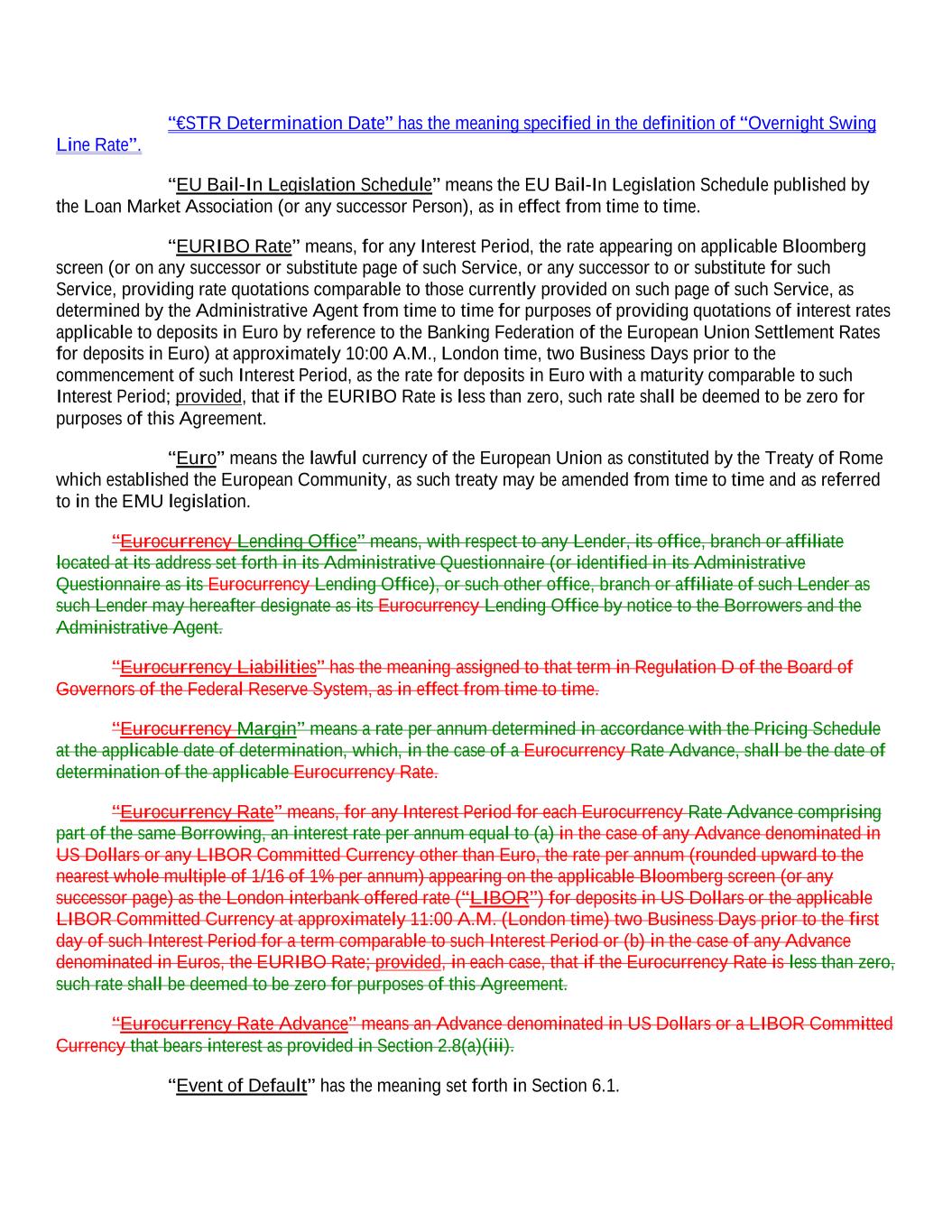 “€STR Determination Date” has the meaning specified in the definition of “Overnight Swing Line Rate”. “EU Bail-In Legislation Schedule” means the EU Bail-In Legislation Schedule published by the Loan Market Association (or any successor Person), as in effect from time to time. “EURIBO Rate” means, for any Interest Period, the rate appearing on applicable Bloomberg screen (or on any successor or substitute page of such Service, or any successor to or substitute for such Service, providing rate quotations comparable to those currently provided on such page of such Service, as determined by the Administrative Agent from time to time for purposes of providing quotations of interest rates applicable to deposits in Euro by reference to the Banking Federation of the European Union Settlement Rates for deposits in Euro) at approximately 10:00 A.M., London time, two Business Days prior to the commencement of such Interest Period, as the rate for deposits in Euro with a maturity comparable to such Interest Period; provided, that if the EURIBO Rate is less than zero, such rate shall be deemed to be zero for purposes of this Agreement. “Euro” means the lawful currency of the European Union as constituted by the Treaty of Rome which established the European Community, as such treaty may be amended from time to time and as referred to in the EMU legislation. “Eurocurrency Lending Office” means, with respect to any Lender, its office, branch or affiliate located at its address set forth in its Administrative Questionnaire (or identified in its Administrative Questionnaire as its Eurocurrency Lending Office), or such other office, branch or affiliate of such Lender as such Lender may hereafter designate as its Eurocurrency Lending Office by notice to the Borrowers and the Administrative Agent. “Eurocurrency Liabilities” has the meaning assigned to that term in Regulation D of the Board of Governors of the Federal Reserve System, as in effect from time to time. “Eurocurrency Margin” means a rate per annum determined in accordance with the Pricing Schedule at the applicable date of determination, which, in the case of a Eurocurrency Rate Advance, shall be the date of determination of the applicable Eurocurrency Rate. “Eurocurrency Rate” means, for any Interest Period for each Eurocurrency Rate Advance comprising part of the same Borrowing, an interest rate per annum equal to (a) in the case of any Advance denominated in US Dollars or any LIBOR Committed Currency other than Euro, the rate per annum (rounded upward to the nearest whole multiple of 1/16 of 1% per annum) appearing on the applicable Bloomberg screen (or any successor page) as the London interbank offered rate (“LIBOR”) for deposits in US Dollars or the applicable LIBOR Committed Currency at approximately 11:00 A.M. (London time) two Business Days prior to the first day of such Interest Period for a term comparable to such Interest Period or (b) in the case of any Advance denominated in Euros, the EURIBO Rate; provided, in each case, that if the Eurocurrency Rate is less than zero, such rate shall be deemed to be zero for purposes of this Agreement. “Eurocurrency Rate Advance” means an Advance denominated in US Dollars or a LIBOR Committed Currency that bears interest as provided in Section 2.8(a)(iii). “Event of Default” has the meaning set forth in Section 6.1.