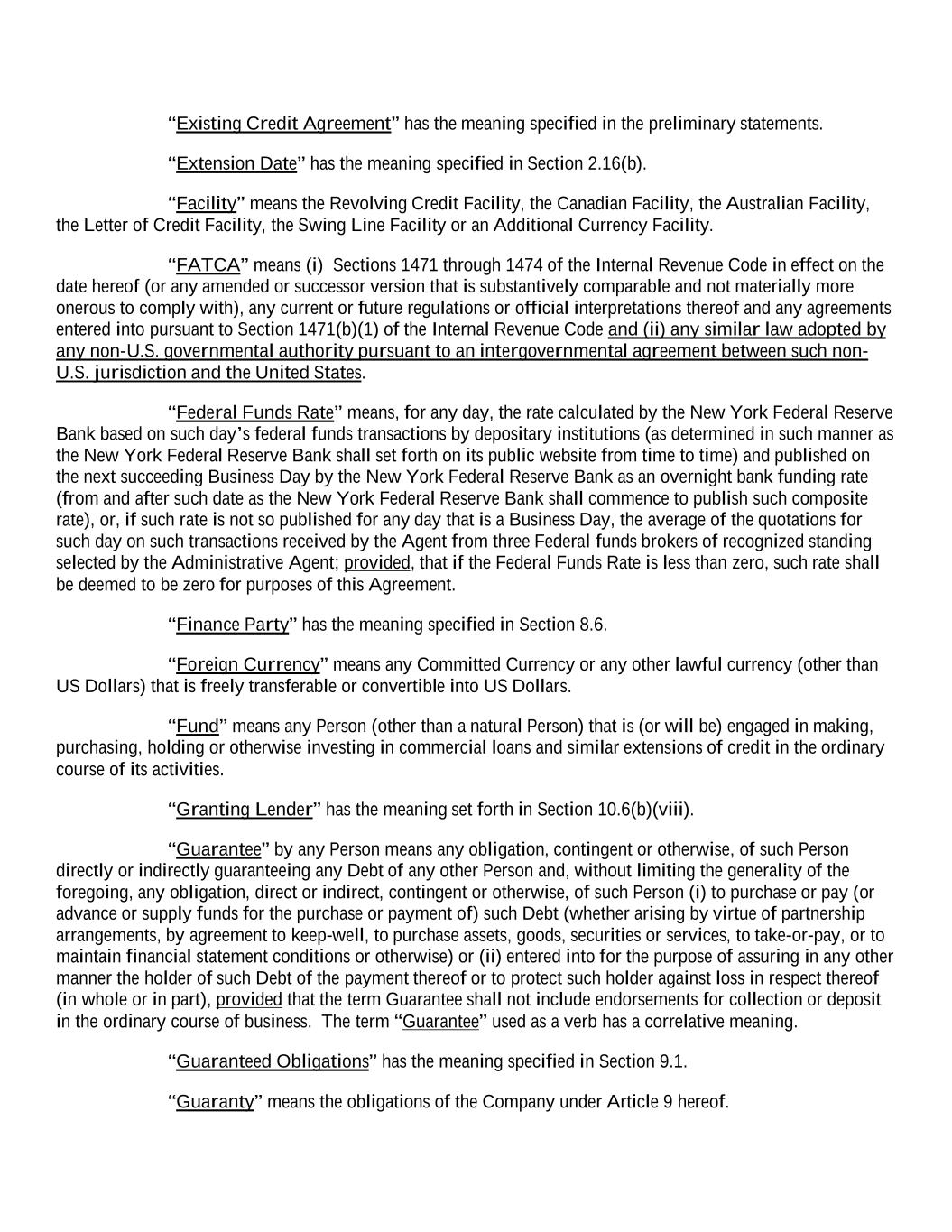 “Existing Credit Agreement” has the meaning specified in the preliminary statements. “Extension Date” has the meaning specified in Section 2.16(b). “Facility” means the Revolving Credit Facility, the Canadian Facility, the Australian Facility, the Letter of Credit Facility, the Swing Line Facility or an Additional Currency Facility. “FATCA” means (i) Sections 1471 through 1474 of the Internal Revenue Code in effect on the date hereof (or any amended or successor version that is substantively comparable and not materially more onerous to comply with), any current or future regulations or official interpretations thereof and any agreements entered into pursuant to Section 1471(b)(1) of the Internal Revenue Code and (ii) any similar law adopted by any non-U.S. governmental authority pursuant to an intergovernmental agreement between such non- U.S. jurisdiction and the United States. “Federal Funds Rate” means, for any day, the rate calculated by the New York Federal Reserve Bank based on such day’s federal funds transactions by depositary institutions (as determined in such manner as the New York Federal Reserve Bank shall set forth on its public website from time to time) and published on the next succeeding Business Day by the New York Federal Reserve Bank as an overnight bank funding rate (from and after such date as the New York Federal Reserve Bank shall commence to publish such composite rate), or, if such rate is not so published for any day that is a Business Day, the average of the quotations for such day on such transactions received by the Agent from three Federal funds brokers of recognized standing selected by the Administrative Agent; provided, that if the Federal Funds Rate is less than zero, such rate shall be deemed to be zero for purposes of this Agreement. “Finance Party” has the meaning specified in Section 8.6. “Foreign Currency” means any Committed Currency or any other lawful currency (other than US Dollars) that is freely transferable or convertible into US Dollars. “Fund” means any Person (other than a natural Person) that is (or will be) engaged in making, purchasing, holding or otherwise investing in commercial loans and similar extensions of credit in the ordinary course of its activities. “Granting Lender” has the meaning set forth in Section 10.6(b)(viii). “Guarantee” by any Person means any obligation, contingent or otherwise, of such Person directly or indirectly guaranteeing any Debt of any other Person and, without limiting the generality of the foregoing, any obligation, direct or indirect, contingent or otherwise, of such Person (i) to purchase or pay (or advance or supply funds for the purchase or payment of) such Debt (whether arising by virtue of partnership arrangements, by agreement to keep-well, to purchase assets, goods, securities or services, to take-or-pay, or to maintain financial statement conditions or otherwise) or (ii) entered into for the purpose of assuring in any other manner the holder of such Debt of the payment thereof or to protect such holder against loss in respect thereof (in whole or in part), provided that the term Guarantee shall not include endorsements for collection or deposit in the ordinary course of business. The term “Guarantee” used as a verb has a correlative meaning. “Guaranteed Obligations” has the meaning specified in Section 9.1. “Guaranty” means the obligations of the Company under Article 9 hereof.