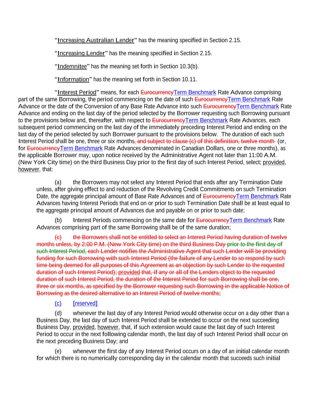 “Increasing Australian Lender” has the meaning specified in Section 2.15. “Increasing Lender” has the meaning specified in Section 2.15. “Indemnitee” has the meaning set forth in Section 10.3(b). “Information” has the meaning set forth in Section 10.11. “Interest Period” means, for each EurocurrencyTerm Benchmark Rate Advance comprising part of the same Borrowing, the period commencing on the date of such EurocurrencyTerm Benchmark Rate Advance or the date of the Conversion of any Base Rate Advance into such EurocurrencyTerm Benchmark Rate Advance and ending on the last day of the period selected by the Borrower requesting such Borrowing pursuant to the provisions below and, thereafter, with respect to EurocurrencyTerm Benchmark Rate Advances, each subsequent period commencing on the last day of the immediately preceding Interest Period and ending on the last day of the period selected by such Borrower pursuant to the provisions below. The duration of each such Interest Period shall be one, three or six months, and subject to clause (c) of this definition, twelve month (or, for EurocurrencyTerm Benchmark Rate Advances denominated in Canadian Dollars, one or three months), as the applicable Borrower may, upon notice received by the Administrative Agent not later than 11:00 A.M. (New York City time) on the third Business Day prior to the first day of such Interest Period, select; provided, however, that: (a) the Borrowers may not select any Interest Period that ends after any Termination Date unless, after giving effect to and reduction of the Revolving Credit Commitments on such Termination Date, the aggregate principal amount of Base Rate Advances and of EurocurrencyTerm Benchmark Rate Advances having Interest Periods that end on or prior to such Termination Date shall be at least equal to the aggregate principal amount of Advances due and payable on or prior to such date; (b) Interest Periods commencing on the same date for EurocurrencyTerm Benchmark Rate Advances comprising part of the same Borrowing shall be of the same duration; (c) the Borrowers shall not be entitled to select an Interest Period having duration of twelve months unless, by 2:00 P.M. (New York City time) on the third Business Day prior to the first day of such Interest Period, each Lender notifies the Administrative Agent that such Lender will be providing funding for such Borrowing with such Interest Period (the failure of any Lender to so respond by such time being deemed for all purposes of this Agreement as an objection by such Lender to the requested duration of such Interest Period); provided that, if any or all of the Lenders object to the requested duration of such Interest Period, the duration of the Interest Period for such Borrowing shall be one, three or six months, as specified by the Borrower requesting such Borrowing in the applicable Notice of Borrowing as the desired alternative to an Interest Period of twelve months; (c) [reserved] (d) whenever the last day of any Interest Period would otherwise occur on a day other than a Business Day, the last day of such Interest Period shall be extended to occur on the next succeeding Business Day, provided, however, that, if such extension would cause the last day of such Interest Period to occur in the next following calendar month, the last day of such Interest Period shall occur on the next preceding Business Day; and (e) whenever the first day of any Interest Period occurs on a day of an initial calendar month for which there is no numerically corresponding day in the calendar month that succeeds such initial