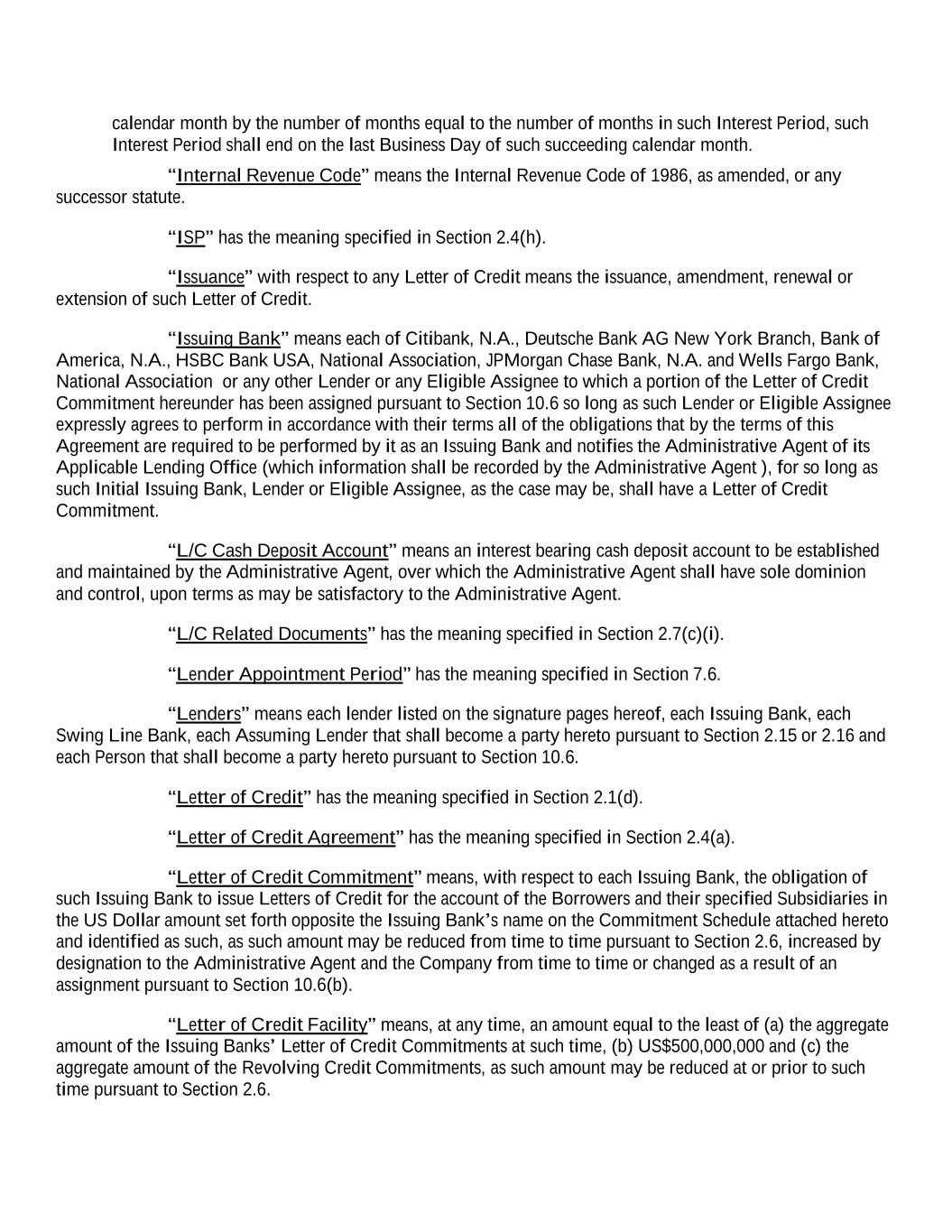 calendar month by the number of months equal to the number of months in such Interest Period, such Interest Period shall end on the last Business Day of such succeeding calendar month. “Internal Revenue Code” means the Internal Revenue Code of 1986, as amended, or any successor statute. “ISP” has the meaning specified in Section 2.4(h). “Issuance” with respect to any Letter of Credit means the issuance, amendment, renewal or extension of such Letter of Credit. “Issuing Bank” means each of Citibank, N.A., Deutsche Bank AG New York Branch, Bank of America, N.A., HSBC Bank USA, National Association, JPMorgan Chase Bank, N.A. and Wells Fargo Bank, National Association or any other Lender or any Eligible Assignee to which a portion of the Letter of Credit Commitment hereunder has been assigned pursuant to Section 10.6 so long as such Lender or Eligible Assignee expressly agrees to perform in accordance with their terms all of the obligations that by the terms of this Agreement are required to be performed by it as an Issuing Bank and notifies the Administrative Agent of its Applicable Lending Office (which information shall be recorded by the Administrative Agent ), for so long as such Initial Issuing Bank, Lender or Eligible Assignee, as the case may be, shall have a Letter of Credit Commitment. “L/C Cash Deposit Account” means an interest bearing cash deposit account to be established and maintained by the Administrative Agent, over which the Administrative Agent shall have sole dominion and control, upon terms as may be satisfactory to the Administrative Agent. “L/C Related Documents” has the meaning specified in Section 2.7(c)(i). “Lender Appointment Period” has the meaning specified in Section 7.6. “Lenders” means each lender listed on the signature pages hereof, each Issuing Bank, each Swing Line Bank, each Assuming Lender that shall become a party hereto pursuant to Section 2.15 or 2.16 and each Person that shall become a party hereto pursuant to Section 10.6. “Letter of Credit” has the meaning specified in Section 2.1(d). “Letter of Credit Agreement” has the meaning specified in Section 2.4(a). “Letter of Credit Commitment” means, with respect to each Issuing Bank, the obligation of such Issuing Bank to issue Letters of Credit for the account of the Borrowers and their specified Subsidiaries in the US Dollar amount set forth opposite the Issuing Bank’s name on the Commitment Schedule attached hereto and identified as such, as such amount may be reduced from time to time pursuant to Section 2.6, increased by designation to the Administrative Agent and the Company from time to time or changed as a result of an assignment pursuant to Section 10.6(b). “Letter of Credit Facility” means, at any time, an amount equal to the least of (a) the aggregate amount of the Issuing Banks’ Letter of Credit Commitments at such time, (b) US$500,000,000 and (c) the aggregate amount of the Revolving Credit Commitments, as such amount may be reduced at or prior to such time pursuant to Section 2.6.