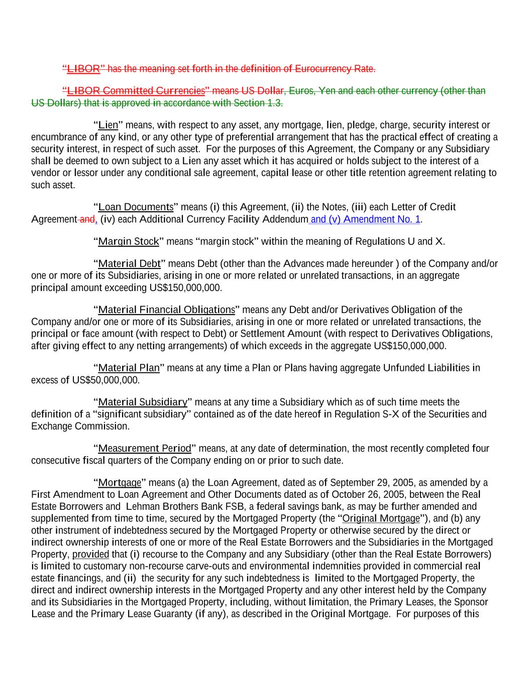 “LIBOR” has the meaning set forth in the definition of Eurocurrency Rate. “LIBOR Committed Currencies” means US Dollar, Euros, Yen and each other currency (other than US Dollars) that is approved in accordance with Section 1.3. “Lien” means, with respect to any asset, any mortgage, lien, pledge, charge, security interest or encumbrance of any kind, or any other type of preferential arrangement that has the practical effect of creating a security interest, in respect of such asset. For the purposes of this Agreement, the Company or any Subsidiary shall be deemed to own subject to a Lien any asset which it has acquired or holds subject to the interest of a vendor or lessor under any conditional sale agreement, capital lease or other title retention agreement relating to such asset. “Loan Documents” means (i) this Agreement, (ii) the Notes, (iii) each Letter of Credit Agreement and, (iv) each Additional Currency Facility Addendum and (v) Amendment No. 1. “Margin Stock” means “margin stock” within the meaning of Regulations U and X. “Material Debt” means Debt (other than the Advances made hereunder ) of the Company and/or one or more of its Subsidiaries, arising in one or more related or unrelated transactions, in an aggregate principal amount exceeding US$150,000,000. “Material Financial Obligations” means any Debt and/or Derivatives Obligation of the Company and/or one or more of its Subsidiaries, arising in one or more related or unrelated transactions, the principal or face amount (with respect to Debt) or Settlement Amount (with respect to Derivatives Obligations, after giving effect to any netting arrangements) of which exceeds in the aggregate US$150,000,000. “Material Plan” means at any time a Plan or Plans having aggregate Unfunded Liabilities in excess of US$50,000,000. “Material Subsidiary” means at any time a Subsidiary which as of such time meets the definition of a “significant subsidiary” contained as of the date hereof in Regulation S-X of the Securities and Exchange Commission. “Measurement Period” means, at any date of determination, the most recently completed four consecutive fiscal quarters of the Company ending on or prior to such date. “Mortgage” means (a) the Loan Agreement, dated as of September 29, 2005, as amended by a First Amendment to Loan Agreement and Other Documents dated as of October 26, 2005, between the Real Estate Borrowers and Lehman Brothers Bank FSB, a federal savings bank, as may be further amended and supplemented from time to time, secured by the Mortgaged Property (the “Original Mortgage”), and (b) any other instrument of indebtedness secured by the Mortgaged Property or otherwise secured by the direct or indirect ownership interests of one or more of the Real Estate Borrowers and the Subsidiaries in the Mortgaged Property, provided that (i) recourse to the Company and any Subsidiary (other than the Real Estate Borrowers) is limited to customary non-recourse carve-outs and environmental indemnities provided in commercial real estate financings, and (ii) the security for any such indebtedness is limited to the Mortgaged Property, the direct and indirect ownership interests in the Mortgaged Property and any other interest held by the Company and its Subsidiaries in the Mortgaged Property, including, without limitation, the Primary Leases, the Sponsor Lease and the Primary Lease Guaranty (if any), as described in the Original Mortgage. For purposes of this