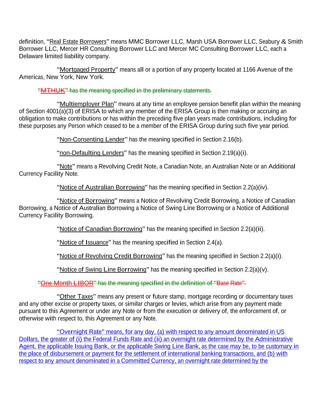 definition, “Real Estate Borrowers” means MMC Borrower LLC, Marsh USA Borrower LLC, Seabury & Smith Borrower LLC, Mercer HR Consulting Borrower LLC and Mercer MC Consulting Borrower LLC, each a Delaware limited liability company. “Mortgaged Property” means all or a portion of any property located at 1166 Avenue of the Americas, New York, New York. “MTHUK” has the meaning specified in the preliminary statements. “Multiemployer Plan” means at any time an employee pension benefit plan within the meaning of Section 4001(a)(3) of ERISA to which any member of the ERISA Group is then making or accruing an obligation to make contributions or has within the preceding five plan years made contributions, including for these purposes any Person which ceased to be a member of the ERISA Group during such five year period. “Non-Consenting Lender” has the meaning specified in Section 2.16(b). “non-Defaulting Lenders” has the meaning specified in Section 2.19(a)(i). “Note” means a Revolving Credit Note, a Canadian Note, an Australian Note or an Additional Currency Facility Note. “Notice of Australian Borrowing” has the meaning specified in Section 2.2(a)(iv). “Notice of Borrowing” means a Notice of Revolving Credit Borrowing, a Notice of Canadian Borrowing, a Notice of Australian Borrowing a Notice of Swing Line Borrowing or a Notice of Additional Currency Facility Borrowing. “Notice of Canadian Borrowing” has the meaning specified in Section 2.2(a)(ii). “Notice of Issuance” has the meaning specified in Section 2.4(a). “Notice of Revolving Credit Borrowing” has the meaning specified in Section 2.2(a)(i). “Notice of Swing Line Borrowing” has the meaning specified in Section 2.2(a)(v). “One Month LIBOR” has the meaning specified in the definition of “Base Rate”. “Other Taxes” means any present or future stamp, mortgage recording or documentary taxes and any other excise or property taxes, or similar charges or levies, which arise from any payment made pursuant to this Agreement or under any Note or from the execution or delivery of, the enforcement of, or otherwise with respect to, this Agreement or any Note. “Overnight Rate” means, for any day, (a) with respect to any amount denominated in US Dollars, the greater of (i) the Federal Funds Rate and (ii) an overnight rate determined by the Administrative Agent, the applicable Issuing Bank, or the applicable Swing Line Bank, as the case may be, to be customary in the place of disbursement or payment for the settlement of international banking transactions, and (b) with respect to any amount denominated in a Committed Currency, an overnight rate determined by the