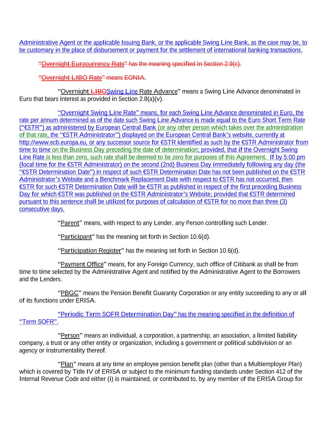 Administrative Agent or the applicable Issuing Bank, or the applicable Swing Line Bank, as the case may be, to be customary in the place of disbursement or payment for the settlement of international banking transactions. “Overnight Eurocurrency Rate” has the meaning specified in Section 2.9(c). “Overnight LIBO Rate” means EONIA. “Overnight LIBOSwing Line Rate Advance” means a Swing Line Advance denominated in Euro that bears interest as provided in Section 2.8(a)(v). “Overnight Swing Line Rate” means, for each Swing Line Advance denominated in Euro, the rate per annum determined as of the date such Swing Line Advance is made equal to the Euro Short Term Rate (“€STR”) as administered by European Central Bank (or any other person which takes over the administration of that rate, the “€STR Administrator”) displayed on the European Central Bank’s website, currently at http://www.ecb.europa.eu, or any successor source for €STR identified as such by the €STR Administrator from time to time on the Business Day preceding the date of determination; provided, that if the Overnight Swing Line Rate is less than zero, such rate shall be deemed to be zero for purposes of this Agreement. If by 5:00 pm (local time for the €STR Administrator) on the second (2nd) Business Day immediately following any day (the “€STR Determination Date”) in respect of such €STR Determination Date has not been published on the €STR Administrator’s Website and a Benchmark Replacement Date with respect to €STR has not occurred, then €STR for such €STR Determination Date will be €STR as published in respect of the first preceding Business Day for which €STR was published on the €STR Administrator’s Website; provided that €STR determined pursuant to this sentence shall be utilized for purposes of calculation of €STR for no more than three (3) consecutive days. “Parent” means, with respect to any Lender, any Person controlling such Lender. “Participant” has the meaning set forth in Section 10.6(d). “Participation Register” has the meaning set forth in Section 10.6(d). “Payment Office” means, for any Foreign Currency, such office of Citibank as shall be from time to time selected by the Administrative Agent and notified by the Administrative Agent to the Borrowers and the Lenders. “PBGC” means the Pension Benefit Guaranty Corporation or any entity succeeding to any or all of its functions under ERISA. “Periodic Term SOFR Determination Day” has the meaning specified in the definition of “Term SOFR”. “Person” means an individual, a corporation, a partnership, an association, a limited liability company, a trust or any other entity or organization, including a government or political subdivision or an agency or instrumentality thereof. “Plan” means at any time an employee pension benefit plan (other than a Multiemployer Plan) which is covered by Title IV of ERISA or subject to the minimum funding standards under Section 412 of the Internal Revenue Code and either (i) is maintained, or contributed to, by any member of the ERISA Group for