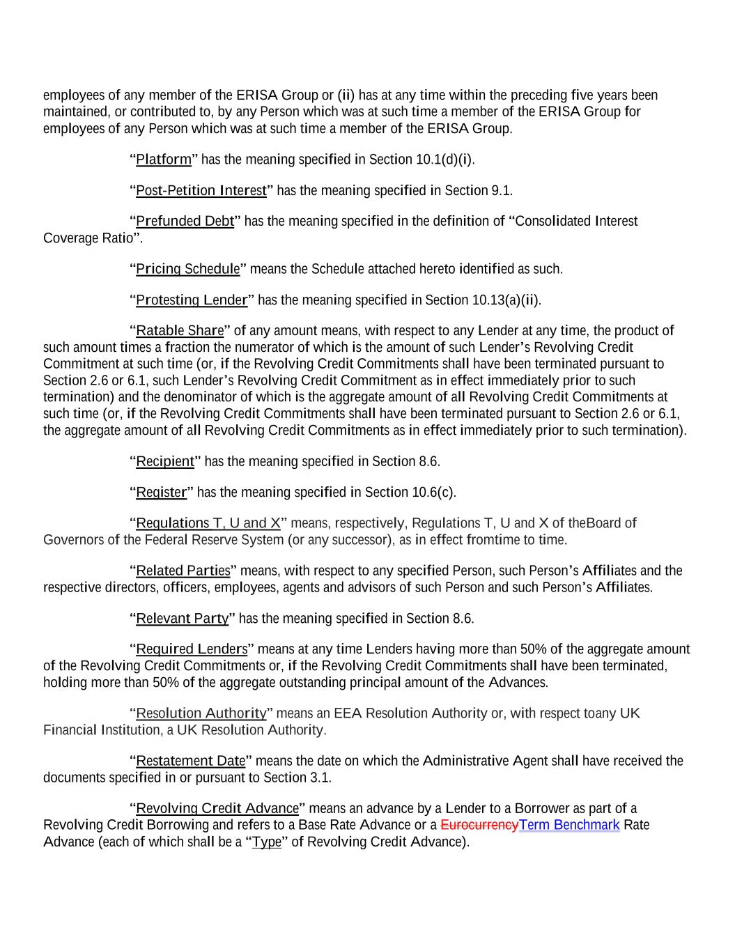 employees of any member of the ERISA Group or (ii) has at any time within the preceding five years been maintained, or contributed to, by any Person which was at such time a member of the ERISA Group for employees of any Person which was at such time a member of the ERISA Group. “Platform” has the meaning specified in Section 10.1(d)(i). “Post-Petition Interest” has the meaning specified in Section 9.1. “Prefunded Debt” has the meaning specified in the definition of “Consolidated Interest Coverage Ratio”. “Pricing Schedule” means the Schedule attached hereto identified as such. “Protesting Lender” has the meaning specified in Section 10.13(a)(ii). “Ratable Share” of any amount means, with respect to any Lender at any time, the product of such amount times a fraction the numerator of which is the amount of such Lender’s Revolving Credit Commitment at such time (or, if the Revolving Credit Commitments shall have been terminated pursuant to Section 2.6 or 6.1, such Lender’s Revolving Credit Commitment as in effect immediately prior to such termination) and the denominator of which is the aggregate amount of all Revolving Credit Commitments at such time (or, if the Revolving Credit Commitments shall have been terminated pursuant to Section 2.6 or 6.1, the aggregate amount of all Revolving Credit Commitments as in effect immediately prior to such termination). “Recipient” has the meaning specified in Section 8.6. “Register” has the meaning specified in Section 10.6(c). “Regulations T, U and X” means, respectively, Regulations T, U and X of the Board of Governors of the Federal Reserve System (or any successor), as in effect from time to time. “Related Parties” means, with respect to any specified Person, such Person’s Affiliates and the respective directors, officers, employees, agents and advisors of such Person and such Person’s Affiliates. “Relevant Party” has the meaning specified in Section 8.6. “Required Lenders” means at any time Lenders having more than 50% of the aggregate amount of the Revolving Credit Commitments or, if the Revolving Credit Commitments shall have been terminated, holding more than 50% of the aggregate outstanding principal amount of the Advances. “Resolution Authority” means an EEA Resolution Authority or, with respect to any UK Financial Institution, a UK Resolution Authority. “Restatement Date” means the date on which the Administrative Agent shall have received the documents specified in or pursuant to Section 3.1. “Revolving Credit Advance” means an advance by a Lender to a Borrower as part of a Revolving Credit Borrowing and refers to a Base Rate Advance or a EurocurrencyTerm Benchmark Rate Advance (each of which shall be a “Type” of Revolving Credit Advance).