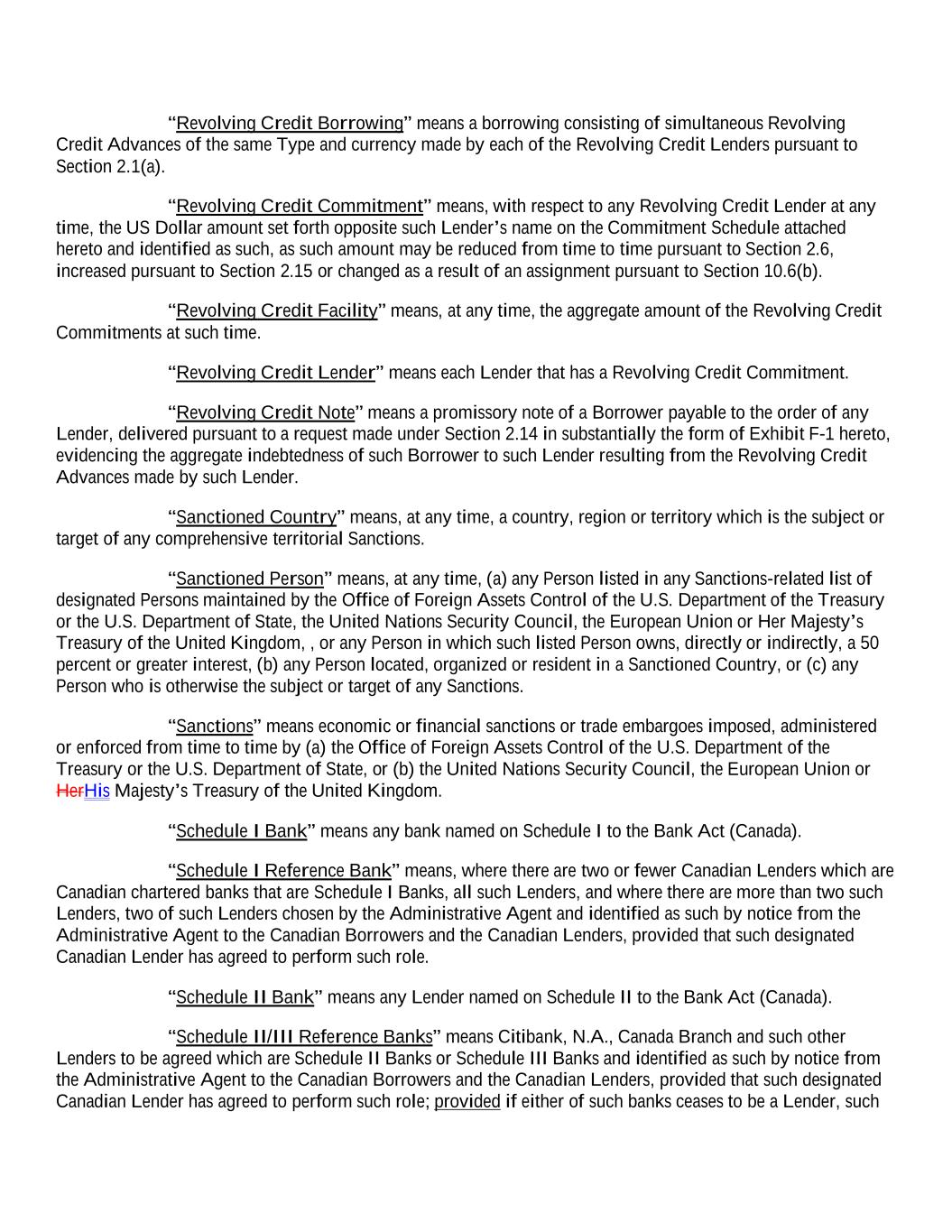 “Revolving Credit Borrowing” means a borrowing consisting of simultaneous Revolving Credit Advances of the same Type and currency made by each of the Revolving Credit Lenders pursuant to Section 2.1(a). “Revolving Credit Commitment” means, with respect to any Revolving Credit Lender at any time, the US Dollar amount set forth opposite such Lender’s name on the Commitment Schedule attached hereto and identified as such, as such amount may be reduced from time to time pursuant to Section 2.6, increased pursuant to Section 2.15 or changed as a result of an assignment pursuant to Section 10.6(b). “Revolving Credit Facility” means, at any time, the aggregate amount of the Revolving Credit Commitments at such time. “Revolving Credit Lender” means each Lender that has a Revolving Credit Commitment. “Revolving Credit Note” means a promissory note of a Borrower payable to the order of any Lender, delivered pursuant to a request made under Section 2.14 in substantially the form of Exhibit F-1 hereto, evidencing the aggregate indebtedness of such Borrower to such Lender resulting from the Revolving Credit Advances made by such Lender. “Sanctioned Country” means, at any time, a country, region or territory which is the subject or target of any comprehensive territorial Sanctions. “Sanctioned Person” means, at any time, (a) any Person listed in any Sanctions-related list of designated Persons maintained by the Office of Foreign Assets Control of the U.S. Department of the Treasury or the U.S. Department of State, the United Nations Security Council, the European Union or Her Majesty’s Treasury of the United Kingdom, , or any Person in which such listed Person owns, directly or indirectly, a 50 percent or greater interest, (b) any Person located, organized or resident in a Sanctioned Country, or (c) any Person who is otherwise the subject or target of any Sanctions. “Sanctions” means economic or financial sanctions or trade embargoes imposed, administered or enforced from time to time by (a) the Office of Foreign Assets Control of the U.S. Department of the Treasury or the U.S. Department of State, or (b) the United Nations Security Council, the European Union or HerHis Majesty’s Treasury of the United Kingdom. “Schedule I Bank” means any bank named on Schedule I to the Bank Act (Canada). “Schedule I Reference Bank” means, where there are two or fewer Canadian Lenders which are Canadian chartered banks that are Schedule I Banks, all such Lenders, and where there are more than two such Lenders, two of such Lenders chosen by the Administrative Agent and identified as such by notice from the Administrative Agent to the Canadian Borrowers and the Canadian Lenders, provided that such designated Canadian Lender has agreed to perform such role. “Schedule II Bank” means any Lender named on Schedule II to the Bank Act (Canada). “Schedule II/III Reference Banks” means Citibank, N.A., Canada Branch and such other Lenders to be agreed which are Schedule II Banks or Schedule III Banks and identified as such by notice from the Administrative Agent to the Canadian Borrowers and the Canadian Lenders, provided that such designated Canadian Lender has agreed to perform such role; provided if either of such banks ceases to be a Lender, such