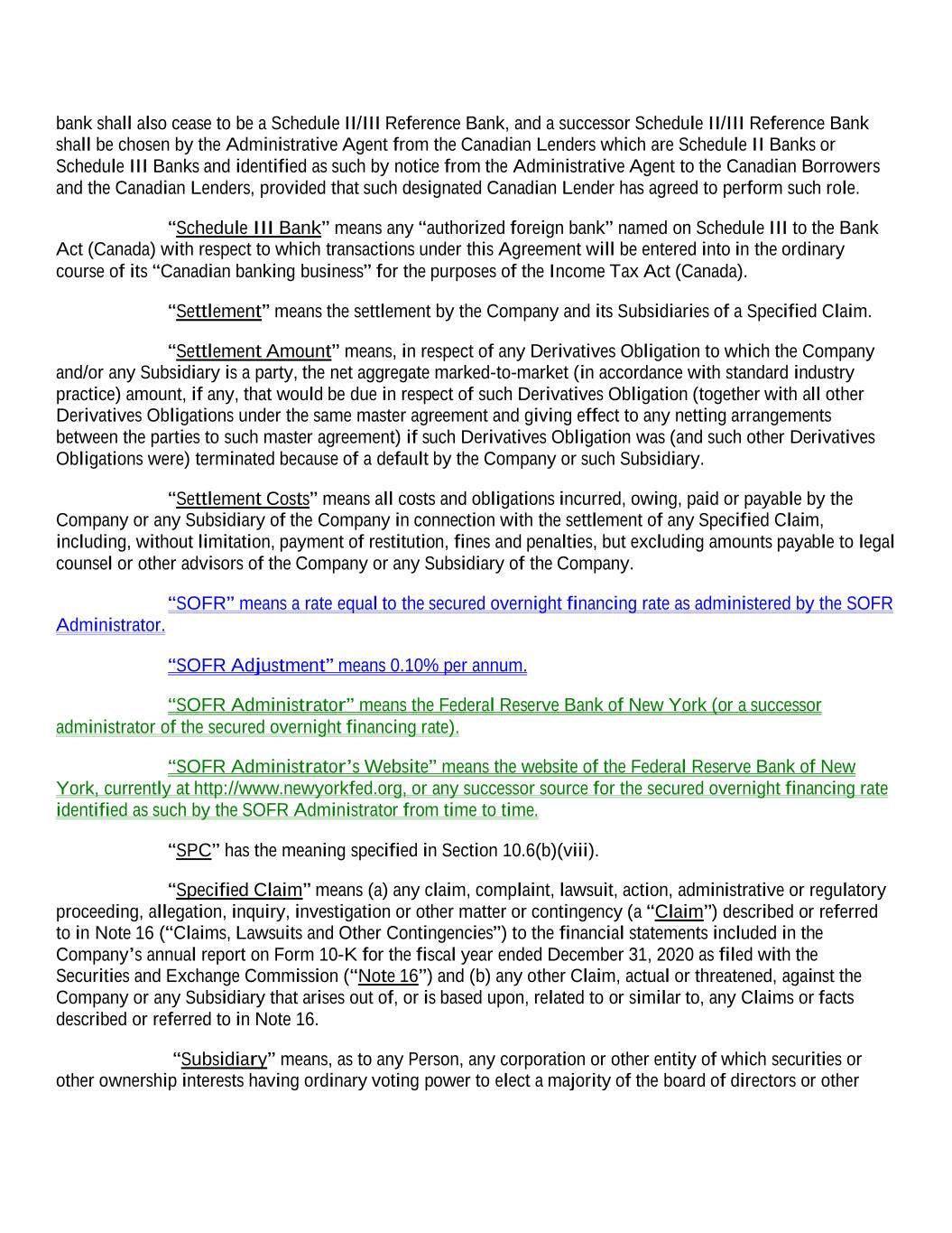 bank shall also cease to be a Schedule II/III Reference Bank, and a successor Schedule II/III Reference Bank shall be chosen by the Administrative Agent from the Canadian Lenders which are Schedule II Banks or Schedule III Banks and identified as such by notice from the Administrative Agent to the Canadian Borrowers and the Canadian Lenders, provided that such designated Canadian Lender has agreed to perform such role. “Schedule III Bank” means any “authorized foreign bank” named on Schedule III to the Bank Act (Canada) with respect to which transactions under this Agreement will be entered into in the ordinary course of its “Canadian banking business” for the purposes of the Income Tax Act (Canada). “Settlement” means the settlement by the Company and its Subsidiaries of a Specified Claim. “Settlement Amount” means, in respect of any Derivatives Obligation to which the Company and/or any Subsidiary is a party, the net aggregate marked-to-market (in accordance with standard industry practice) amount, if any, that would be due in respect of such Derivatives Obligation (together with all other Derivatives Obligations under the same master agreement and giving effect to any netting arrangements between the parties to such master agreement) if such Derivatives Obligation was (and such other Derivatives Obligations were) terminated because of a default by the Company or such Subsidiary. “Settlement Costs” means all costs and obligations incurred, owing, paid or payable by the Company or any Subsidiary of the Company in connection with the settlement of any Specified Claim, including, without limitation, payment of restitution, fines and penalties, but excluding amounts payable to legal counsel or other advisors of the Company or any Subsidiary of the Company. “SOFR” means a rate equal to the secured overnight financing rate as administered by the SOFR Administrator. “SOFR Adjustment” means 0.10% per annum. “SOFR Administrator” means the Federal Reserve Bank of New York (or a successor administrator of the secured overnight financing rate). “SOFR Administrator’s Website” means the website of the Federal Reserve Bank of New York, currently at http://www.newyorkfed.org, or any successor source for the secured overnight financing rate identified as such by the SOFR Administrator from time to time. “SPC” has the meaning specified in Section 10.6(b)(viii). “Specified Claim” means (a) any claim, complaint, lawsuit, action, administrative or regulatory proceeding, allegation, inquiry, investigation or other matter or contingency (a “Claim”) described or referred to in Note 16 (“Claims, Lawsuits and Other Contingencies”) to the financial statements included in the Company’s annual report on Form 10-K for the fiscal year ended December 31, 2020 as filed with the Securities and Exchange Commission (“Note 16”) and (b) any other Claim, actual or threatened, against the Company or any Subsidiary that arises out of, or is based upon, related to or similar to, any Claims or facts described or referred to in Note 16. “Subsidiary” means, as to any Person, any corporation or other entity of which securities or other ownership interests having ordinary voting power to elect a majority of the board of directors or other