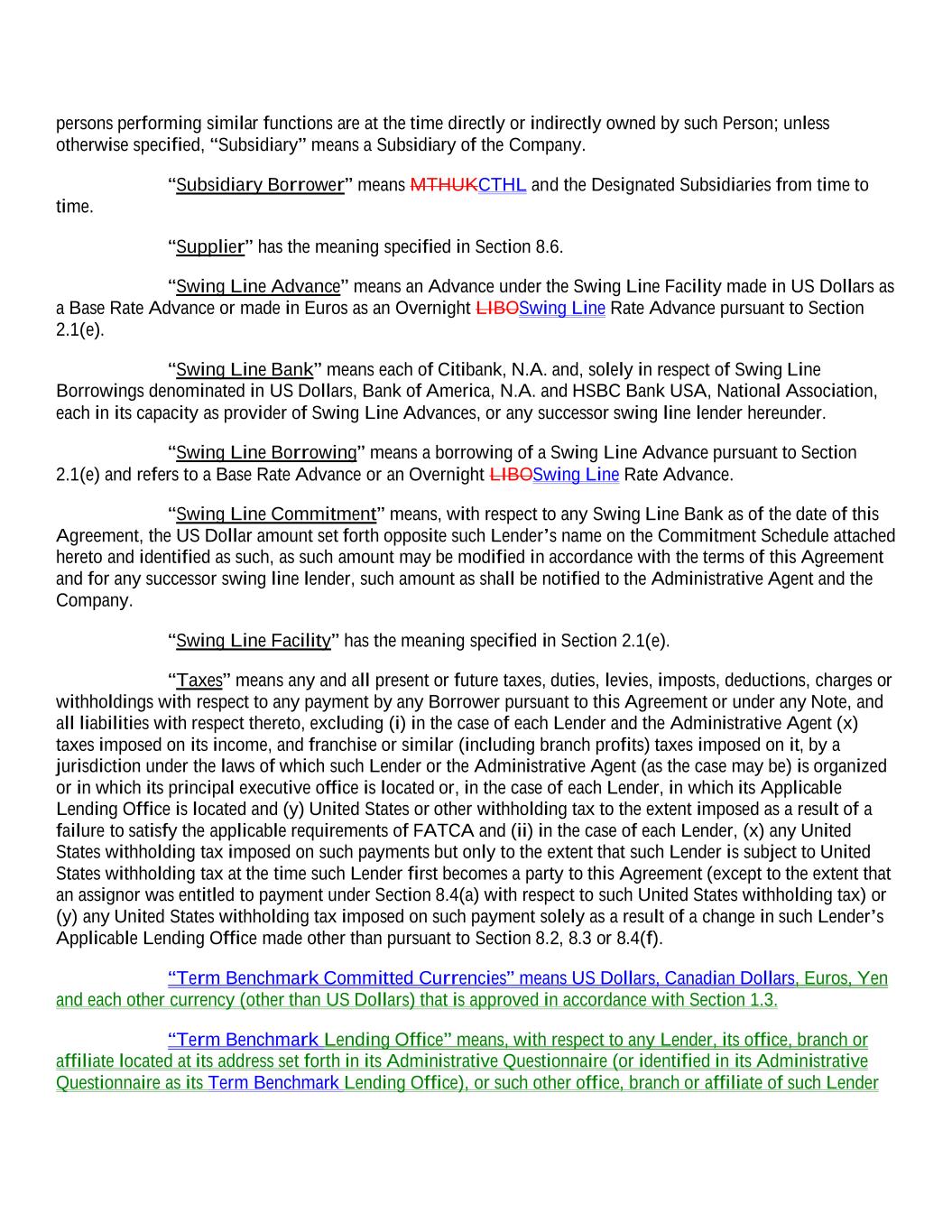 persons performing similar functions are at the time directly or indirectly owned by such Person; unless otherwise specified, “Subsidiary” means a Subsidiary of the Company. “Subsidiary Borrower” means MTHUKCTHL and the Designated Subsidiaries from time to time. “Supplier” has the meaning specified in Section 8.6. “Swing Line Advance” means an Advance under the Swing Line Facility made in US Dollars as a Base Rate Advance or made in Euros as an Overnight LIBOSwing Line Rate Advance pursuant to Section 2.1(e). “Swing Line Bank” means each of Citibank, N.A. and, solely in respect of Swing Line Borrowings denominated in US Dollars, Bank of America, N.A. and HSBC Bank USA, National Association, each in its capacity as provider of Swing Line Advances, or any successor swing line lender hereunder. “Swing Line Borrowing” means a borrowing of a Swing Line Advance pursuant to Section 2.1(e) and refers to a Base Rate Advance or an Overnight LIBOSwing Line Rate Advance. “Swing Line Commitment” means, with respect to any Swing Line Bank as of the date of this Agreement, the US Dollar amount set forth opposite such Lender’s name on the Commitment Schedule attached hereto and identified as such, as such amount may be modified in accordance with the terms of this Agreement and for any successor swing line lender, such amount as shall be notified to the Administrative Agent and the Company. “Swing Line Facility” has the meaning specified in Section 2.1(e). “Taxes” means any and all present or future taxes, duties, levies, imposts, deductions, charges or withholdings with respect to any payment by any Borrower pursuant to this Agreement or under any Note, and all liabilities with respect thereto, excluding (i) in the case of each Lender and the Administrative Agent (x) taxes imposed on its income, and franchise or similar (including branch profits) taxes imposed on it, by a jurisdiction under the laws of which such Lender or the Administrative Agent (as the case may be) is organized or in which its principal executive office is located or, in the case of each Lender, in which its Applicable Lending Office is located and (y) United States or other withholding tax to the extent imposed as a result of a failure to satisfy the applicable requirements of FATCA and (ii) in the case of each Lender, (x) any United States withholding tax imposed on such payments but only to the extent that such Lender is subject to United States withholding tax at the time such Lender first becomes a party to this Agreement (except to the extent that an assignor was entitled to payment under Section 8.4(a) with respect to such United States withholding tax) or (y) any United States withholding tax imposed on such payment solely as a result of a change in such Lender’s Applicable Lending Office made other than pursuant to Section 8.2, 8.3 or 8.4(f). “Term Benchmark Committed Currencies” means US Dollars, Canadian Dollars, Euros, Yen and each other currency (other than US Dollars) that is approved in accordance with Section 1.3. “Term Benchmark Lending Office” means, with respect to any Lender, its office, branch or affiliate located at its address set forth in its Administrative Questionnaire (or identified in its Administrative Questionnaire as its Term Benchmark Lending Office), or such other office, branch or affiliate of such Lender