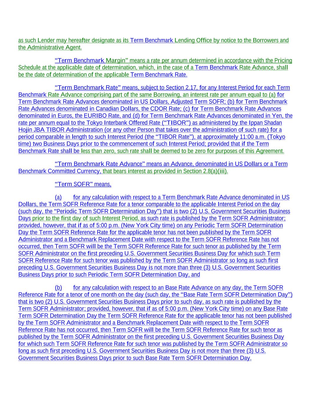 as such Lender may hereafter designate as its Term Benchmark Lending Office by notice to the Borrowers and the Administrative Agent. “Term Benchmark Margin” means a rate per annum determined in accordance with the Pricing Schedule at the applicable date of determination, which, in the case of a Term Benchmark Rate Advance, shall be the date of determination of the applicable Term Benchmark Rate. “Term Benchmark Rate” means, subject to Section 2.17, for any Interest Period for each Term Benchmark Rate Advance comprising part of the same Borrowing, an interest rate per annum equal to (a) for Term Benchmark Rate Advances denominated in US Dollars, Adjusted Term SOFR; (b) for Term Benchmark Rate Advances denominated in Canadian Dollars, the CDOR Rate; (c) for Term Benchmark Rate Advances denominated in Euros, the EURIBO Rate, and (d) for Term Benchmark Rate Advances denominated in Yen, the rate per annum equal to the Tokyo Interbank Offered Rate (“TIBOR”) as administered by the Ippan Shadan Hojin JBA TIBOR Administration (or any other Person that takes over the administration of such rate) for a period comparable in length to such Interest Period (the “TIBOR Rate”), at approximately 11:00 a.m. (Tokyo time) two Business Days prior to the commencement of such Interest Period; provided that if the Term Benchmark Rate shall be less than zero, such rate shall be deemed to be zero for purposes of this Agreement. “Term Benchmark Rate Advance” means an Advance, denominated in US Dollars or a Term Benchmark Committed Currency, that bears interest as provided in Section 2.8(a)(iii). “Term SOFR” means, (a) for any calculation with respect to a Term Benchmark Rate Advance denominated in US Dollars, the Term SOFR Reference Rate for a tenor comparable to the applicable Interest Period on the day (such day, the “Periodic Term SOFR Determination Day”) that is two (2) U.S. Government Securities Business Days prior to the first day of such Interest Period, as such rate is published by the Term SOFR Administrator; provided, however, that if as of 5:00 p.m. (New York City time) on any Periodic Term SOFR Determination Day the Term SOFR Reference Rate for the applicable tenor has not been published by the Term SOFR Administrator and a Benchmark Replacement Date with respect to the Term SOFR Reference Rate has not occurred, then Term SOFR will be the Term SOFR Reference Rate for such tenor as published by the Term SOFR Administrator on the first preceding U.S. Government Securities Business Day for which such Term SOFR Reference Rate for such tenor was published by the Term SOFR Administrator so long as such first preceding U.S. Government Securities Business Day is not more than three (3) U.S. Government Securities Business Days prior to such Periodic Term SOFR Determination Day, and (b) for any calculation with respect to an Base Rate Advance on any day, the Term SOFR Reference Rate for a tenor of one month on the day (such day, the “Base Rate Term SOFR Determination Day”) that is two (2) U.S. Government Securities Business Days prior to such day, as such rate is published by the Term SOFR Administrator; provided, however, that if as of 5:00 p.m. (New York City time) on any Base Rate Term SOFR Determination Day the Term SOFR Reference Rate for the applicable tenor has not been published by the Term SOFR Administrator and a Benchmark Replacement Date with respect to the Term SOFR Reference Rate has not occurred, then Term SOFR will be the Term SOFR Reference Rate for such tenor as published by the Term SOFR Administrator on the first preceding U.S. Government Securities Business Day for which such Term SOFR Reference Rate for such tenor was published by the Term SOFR Administrator so long as such first preceding U.S. Government Securities Business Day is not more than three (3) U.S. Government Securities Business Days prior to such Base Rate Term SOFR Determination Day.