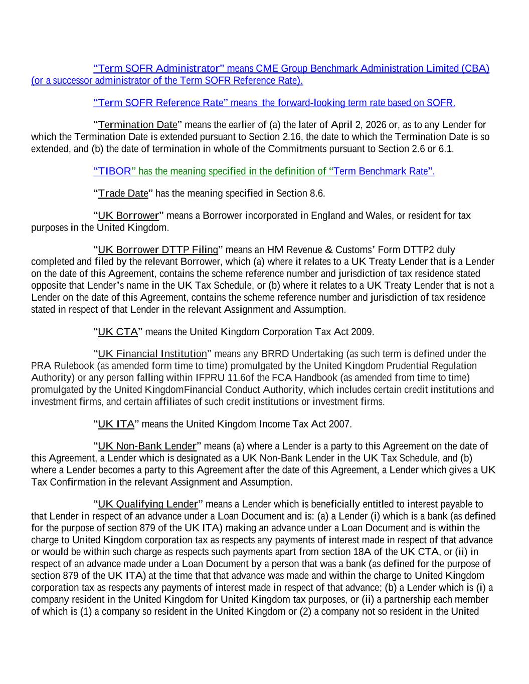 “Term SOFR Administrator” means CME Group Benchmark Administration Limited (CBA) (or a successor administrator of the Term SOFR Reference Rate). “Term SOFR Reference Rate” means the forward-looking term rate based on SOFR. “Termination Date” means the earlier of (a) the later of April 2, 2026 or, as to any Lender for which the Termination Date is extended pursuant to Section 2.16, the date to which the Termination Date is so extended, and (b) the date of termination in whole of the Commitments pursuant to Section 2.6 or 6.1. “TIBOR” has the meaning specified in the definition of “Term Benchmark Rate”. “Trade Date” has the meaning specified in Section 8.6. “UK Borrower” means a Borrower incorporated in England and Wales, or resident for tax purposes in the United Kingdom. “UK Borrower DTTP Filing” means an HM Revenue & Customs’ Form DTTP2 duly completed and filed by the relevant Borrower, which (a) where it relates to a UK Treaty Lender that is a Lender on the date of this Agreement, contains the scheme reference number and jurisdiction of tax residence stated opposite that Lender’s name in the UK Tax Schedule, or (b) where it relates to a UK Treaty Lender that is not a Lender on the date of this Agreement, contains the scheme reference number and jurisdiction of tax residence stated in respect of that Lender in the relevant Assignment and Assumption. “UK CTA” means the United Kingdom Corporation Tax Act 2009. “UK Financial Institution” means any BRRD Undertaking (as such term is defined under the PRA Rulebook (as amended form time to time) promulgated by the United Kingdom Prudential Regulation Authority) or any person falling within IFPRU 11.6 of the FCA Handbook (as amended from time to time) promulgated by the United Kingdom Financial Conduct Authority, which includes certain credit institutions and investment firms, and certain affiliates of such credit institutions or investment firms. “UK ITA” means the United Kingdom Income Tax Act 2007. “UK Non-Bank Lender” means (a) where a Lender is a party to this Agreement on the date of this Agreement, a Lender which is designated as a UK Non-Bank Lender in the UK Tax Schedule, and (b) where a Lender becomes a party to this Agreement after the date of this Agreement, a Lender which gives a UK Tax Confirmation in the relevant Assignment and Assumption. “UK Qualifying Lender” means a Lender which is beneficially entitled to interest payable to that Lender in respect of an advance under a Loan Document and is: (a) a Lender (i) which is a bank (as defined for the purpose of section 879 of the UK ITA) making an advance under a Loan Document and is within the charge to United Kingdom corporation tax as respects any payments of interest made in respect of that advance or would be within such charge as respects such payments apart from section 18A of the UK CTA, or (ii) in respect of an advance made under a Loan Document by a person that was a bank (as defined for the purpose of section 879 of the UK ITA) at the time that that advance was made and within the charge to United Kingdom corporation tax as respects any payments of interest made in respect of that advance; (b) a Lender which is (i) a company resident in the United Kingdom for United Kingdom tax purposes, or (ii) a partnership each member of which is (1) a company so resident in the United Kingdom or (2) a company not so resident in the United