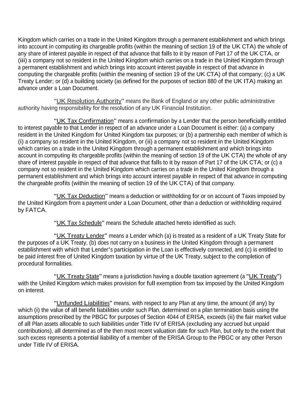 Kingdom which carries on a trade in the United Kingdom through a permanent establishment and which brings into account in computing its chargeable profits (within the meaning of section 19 of the UK CTA) the whole of any share of interest payable in respect of that advance that falls to it by reason of Part 17 of the UK CTA, or (iii) a company not so resident in the United Kingdom which carries on a trade in the United Kingdom through a permanent establishment and which brings into account interest payable in respect of that advance in computing the chargeable profits (within the meaning of section 19 of the UK CTA) of that company; (c) a UK Treaty Lender; or (d) a building society (as defined for the purposes of section 880 of the UK ITA) making an advance under a Loan Document. “UK Resolution Authority” means the Bank of England or any other public administrative authority having responsibility for the resolution of any UK Financial Institution. “UK Tax Confirmation” means a confirmation by a Lender that the person beneficially entitled to interest payable to that Lender in respect of an advance under a Loan Document is either: (a) a company resident in the United Kingdom for United Kingdom tax purposes; or (b) a partnership each member of which is (i) a company so resident in the United Kingdom, or (ii) a company not so resident in the United Kingdom which carries on a trade in the United Kingdom through a permanent establishment and which brings into account in computing its chargeable profits (within the meaning of section 19 of the UK CTA) the whole of any share of interest payable in respect of that advance that falls to it by reason of Part 17 of the UK CTA; or (c) a company not so resident in the United Kingdom which carries on a trade in the United Kingdom through a permanent establishment and which brings into account interest payable in respect of that advance in computing the chargeable profits (within the meaning of section 19 of the UK CTA) of that company. “UK Tax Deduction” means a deduction or withholding for or on account of Taxes imposed by the United Kingdom from a payment under a Loan Document, other than a deduction or withholding required by FATCA. “UK Tax Schedule” means the Schedule attached hereto identified as such. “UK Treaty Lender” means a Lender which (a) is treated as a resident of a UK Treaty State for the purposes of a UK Treaty, (b) does not carry on a business in the United Kingdom through a permanent establishment with which that Lender’s participation in the Loan is effectively connected, and (c) is entitled to be paid interest free of United Kingdom taxation by virtue of the UK Treaty, subject to the completion of procedural formalities. “UK Treaty State” means a jurisdiction having a double taxation agreement (a “UK Treaty”) with the United Kingdom which makes provision for full exemption from tax imposed by the United Kingdom on interest. “Unfunded Liabilities” means, with respect to any Plan at any time, the amount (if any) by which (i) the value of all benefit liabilities under such Plan, determined on a plan termination basis using the assumptions prescribed by the PBGC for purposes of Section 4044 of ERISA, exceeds (ii) the fair market value of all Plan assets allocable to such liabilities under Title IV of ERISA (excluding any accrued but unpaid contributions), all determined as of the then most recent valuation date for such Plan, but only to the extent that such excess represents a potential liability of a member of the ERISA Group to the PBGC or any other Person under Title IV of ERISA.