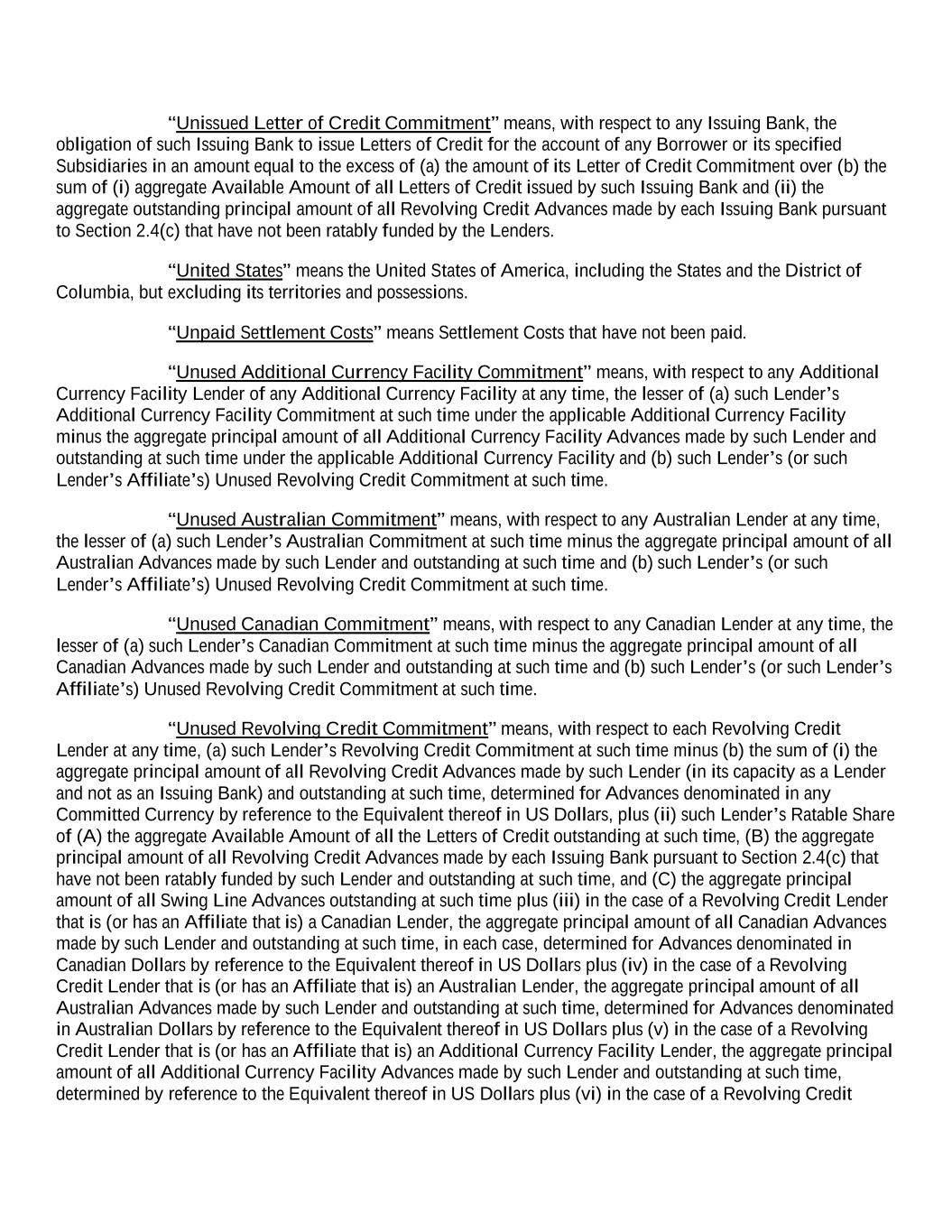 “Unissued Letter of Credit Commitment” means, with respect to any Issuing Bank, the obligation of such Issuing Bank to issue Letters of Credit for the account of any Borrower or its specified Subsidiaries in an amount equal to the excess of (a) the amount of its Letter of Credit Commitment over (b) the sum of (i) aggregate Available Amount of all Letters of Credit issued by such Issuing Bank and (ii) the aggregate outstanding principal amount of all Revolving Credit Advances made by each Issuing Bank pursuant to Section 2.4(c) that have not been ratably funded by the Lenders. “United States” means the United States of America, including the States and the District of Columbia, but excluding its territories and possessions. “Unpaid Settlement Costs” means Settlement Costs that have not been paid. “Unused Additional Currency Facility Commitment” means, with respect to any Additional Currency Facility Lender of any Additional Currency Facility at any time, the lesser of (a) such Lender’s Additional Currency Facility Commitment at such time under the applicable Additional Currency Facility minus the aggregate principal amount of all Additional Currency Facility Advances made by such Lender and outstanding at such time under the applicable Additional Currency Facility and (b) such Lender’s (or such Lender’s Affiliate’s) Unused Revolving Credit Commitment at such time. “Unused Australian Commitment” means, with respect to any Australian Lender at any time, the lesser of (a) such Lender’s Australian Commitment at such time minus the aggregate principal amount of all Australian Advances made by such Lender and outstanding at such time and (b) such Lender’s (or such Lender’s Affiliate’s) Unused Revolving Credit Commitment at such time. “Unused Canadian Commitment” means, with respect to any Canadian Lender at any time, the lesser of (a) such Lender’s Canadian Commitment at such time minus the aggregate principal amount of all Canadian Advances made by such Lender and outstanding at such time and (b) such Lender’s (or such Lender’s Affiliate’s) Unused Revolving Credit Commitment at such time. “Unused Revolving Credit Commitment” means, with respect to each Revolving Credit Lender at any time, (a) such Lender’s Revolving Credit Commitment at such time minus (b) the sum of (i) the aggregate principal amount of all Revolving Credit Advances made by such Lender (in its capacity as a Lender and not as an Issuing Bank) and outstanding at such time, determined for Advances denominated in any Committed Currency by reference to the Equivalent thereof in US Dollars, plus (ii) such Lender’s Ratable Share of (A) the aggregate Available Amount of all the Letters of Credit outstanding at such time, (B) the aggregate principal amount of all Revolving Credit Advances made by each Issuing Bank pursuant to Section 2.4(c) that have not been ratably funded by such Lender and outstanding at such time, and (C) the aggregate principal amount of all Swing Line Advances outstanding at such time plus (iii) in the case of a Revolving Credit Lender that is (or has an Affiliate that is) a Canadian Lender, the aggregate principal amount of all Canadian Advances made by such Lender and outstanding at such time, in each case, determined for Advances denominated in Canadian Dollars by reference to the Equivalent thereof in US Dollars plus (iv) in the case of a Revolving Credit Lender that is (or has an Affiliate that is) an Australian Lender, the aggregate principal amount of all Australian Advances made by such Lender and outstanding at such time, determined for Advances denominated in Australian Dollars by reference to the Equivalent thereof in US Dollars plus (v) in the case of a Revolving Credit Lender that is (or has an Affiliate that is) an Additional Currency Facility Lender, the aggregate principal amount of all Additional Currency Facility Advances made by such Lender and outstanding at such time, determined by reference to the Equivalent thereof in US Dollars plus (vi) in the case of a Revolving Credit