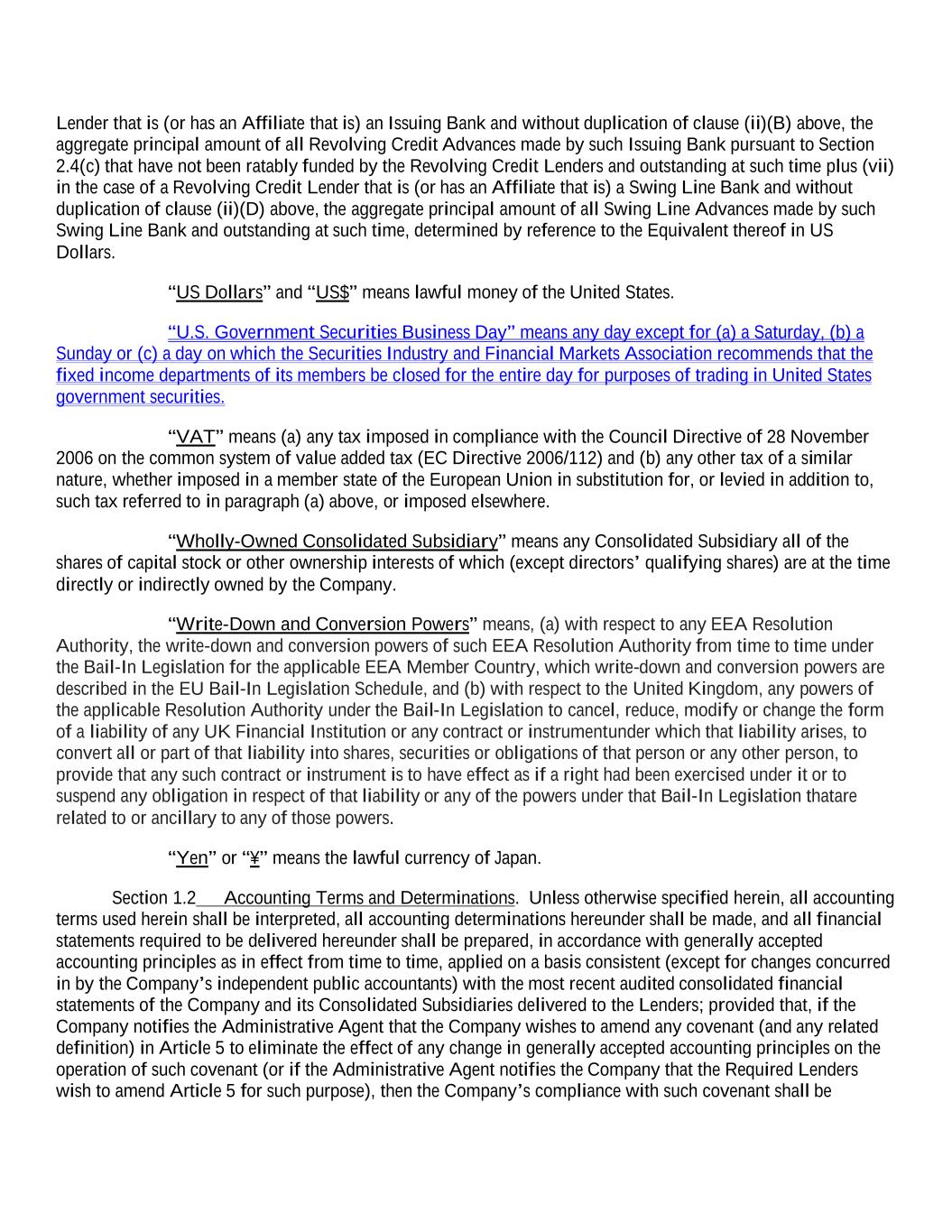 Lender that is (or has an Affiliate that is) an Issuing Bank and without duplication of clause (ii)(B) above, the aggregate principal amount of all Revolving Credit Advances made by such Issuing Bank pursuant to Section 2.4(c) that have not been ratably funded by the Revolving Credit Lenders and outstanding at such time plus (vii) in the case of a Revolving Credit Lender that is (or has an Affiliate that is) a Swing Line Bank and without duplication of clause (ii)(D) above, the aggregate principal amount of all Swing Line Advances made by such Swing Line Bank and outstanding at such time, determined by reference to the Equivalent thereof in US Dollars. “US Dollars” and “US$” means lawful money of the United States. “U.S. Government Securities Business Day” means any day except for (a) a Saturday, (b) a Sunday or (c) a day on which the Securities Industry and Financial Markets Association recommends that the fixed income departments of its members be closed for the entire day for purposes of trading in United States government securities. “VAT” means (a) any tax imposed in compliance with the Council Directive of 28 November 2006 on the common system of value added tax (EC Directive 2006/112) and (b) any other tax of a similar nature, whether imposed in a member state of the European Union in substitution for, or levied in addition to, such tax referred to in paragraph (a) above, or imposed elsewhere. “Wholly-Owned Consolidated Subsidiary” means any Consolidated Subsidiary all of the shares of capital stock or other ownership interests of which (except directors’ qualifying shares) are at the time directly or indirectly owned by the Company. “Write-Down and Conversion Powers” means, (a) with respect to any EEA Resolution Authority, the write-down and conversion powers of such EEA Resolution Authority from time to time under the Bail-In Legislation for the applicable EEA Member Country, which write-down and conversion powers are described in the EU Bail-In Legislation Schedule, and (b) with respect to the United Kingdom, any powers of the applicable Resolution Authority under the Bail-In Legislation to cancel, reduce, modify or change the form of a liability of any UK Financial Institution or any contract or instrument under which that liability arises, to convert all or part of that liability into shares, securities or obligations of that person or any other person, to provide that any such contract or instrument is to have effect as if a right had been exercised under it or to suspend any obligation in respect of that liability or any of the powers under that Bail-In Legislation that are related to or ancillary to any of those powers. “Yen” or “¥” means the lawful currency of Japan. Section 1.2 Accounting Terms and Determinations. Unless otherwise specified herein, all accounting terms used herein shall be interpreted, all accounting determinations hereunder shall be made, and all financial statements required to be delivered hereunder shall be prepared, in accordance with generally accepted accounting principles as in effect from time to time, applied on a basis consistent (except for changes concurred in by the Company’s independent public accountants) with the most recent audited consolidated financial statements of the Company and its Consolidated Subsidiaries delivered to the Lenders; provided that, if the Company notifies the Administrative Agent that the Company wishes to amend any covenant (and any related definition) in Article 5 to eliminate the effect of any change in generally accepted accounting principles on the operation of such covenant (or if the Administrative Agent notifies the Company that the Required Lenders wish to amend Article 5 for such purpose), then the Company’s compliance with such covenant shall be